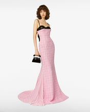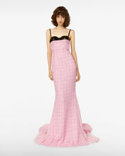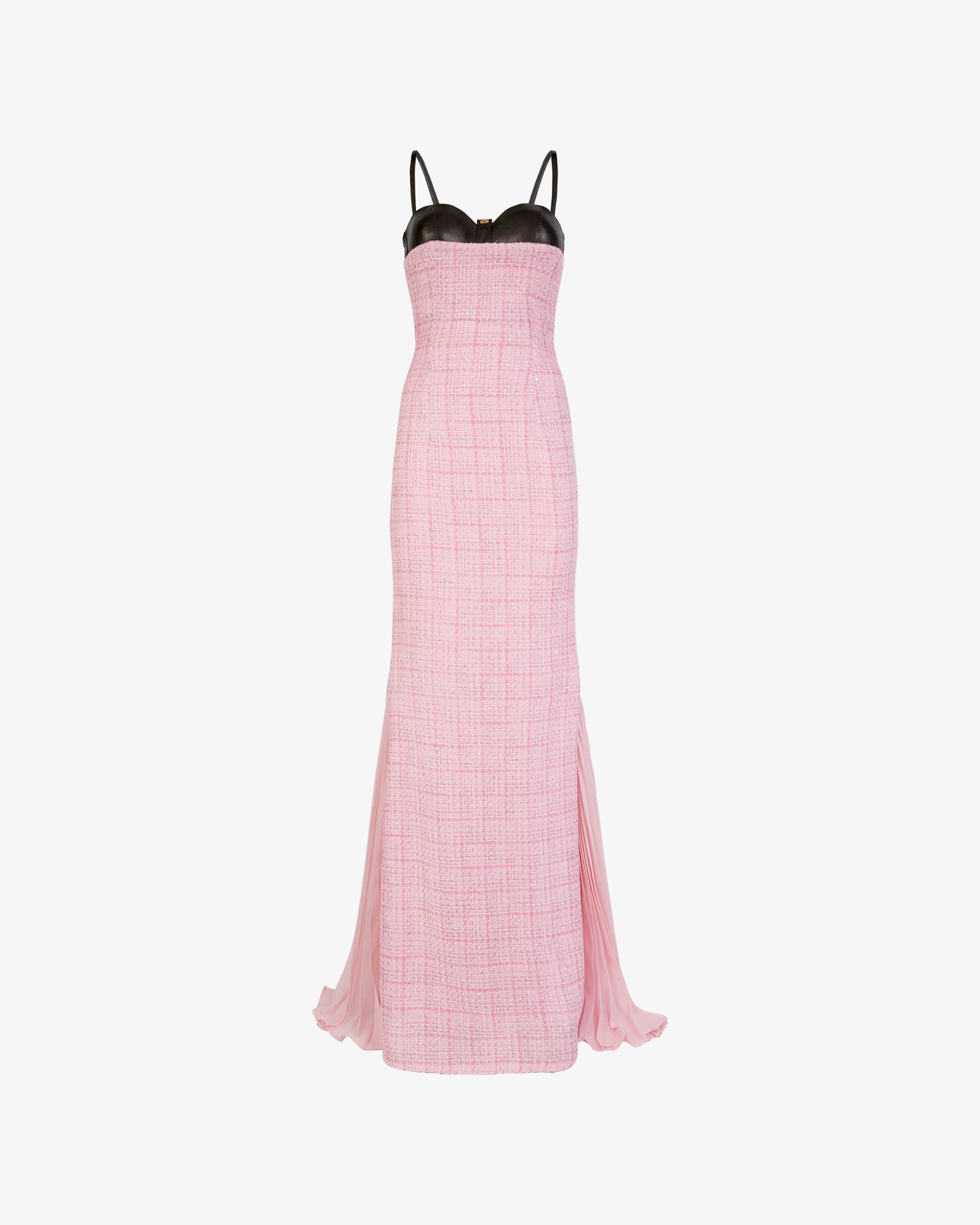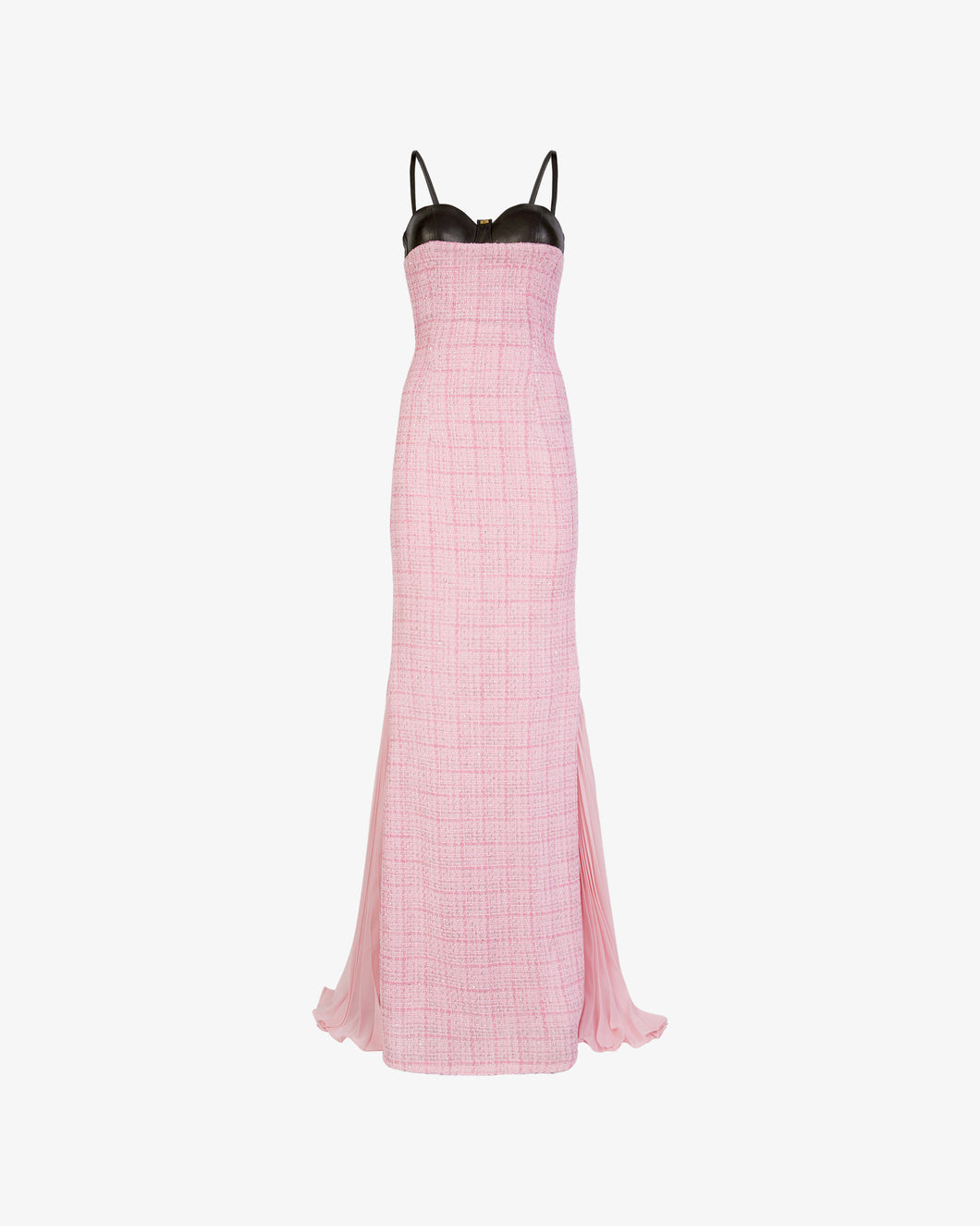 Long dress made of cotton-blend tweed, embellished with bright sequins. The dress is completed with a contrasting black leather bra.