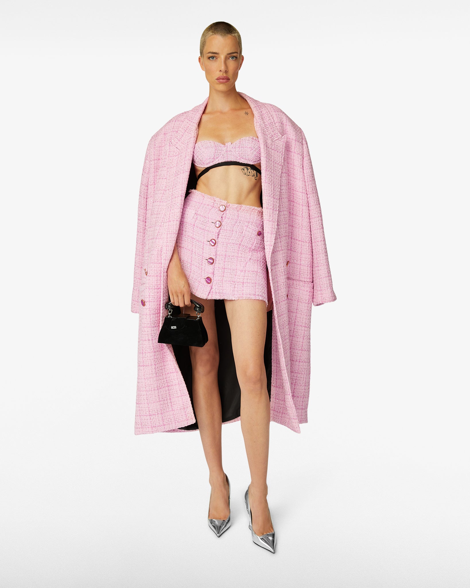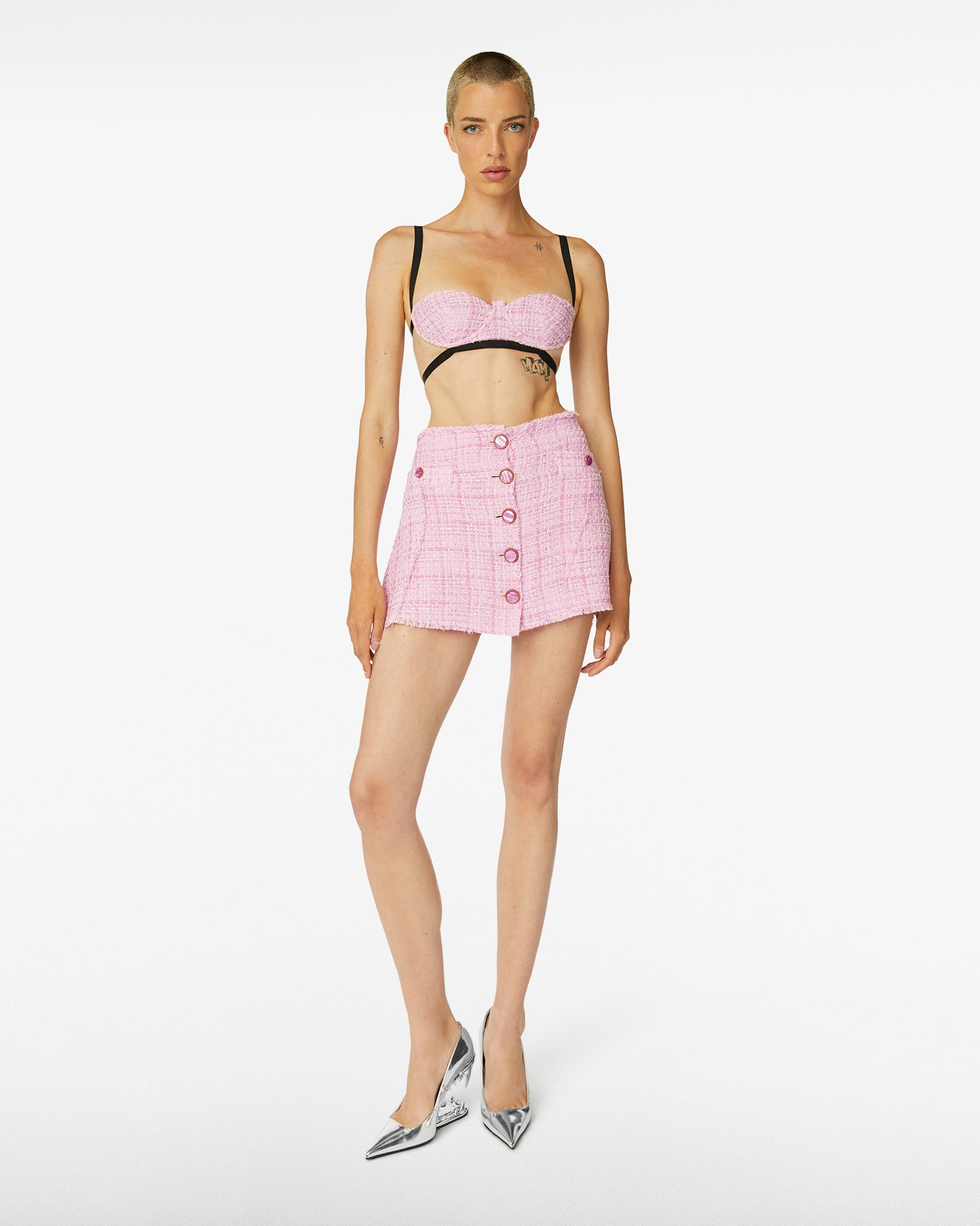 Skip to contentMini skirt in a feminine silhouette made from cotton-blend tweed, embellished with bright sequins. Front closure with tone-on-tone nacre logoed buttons.