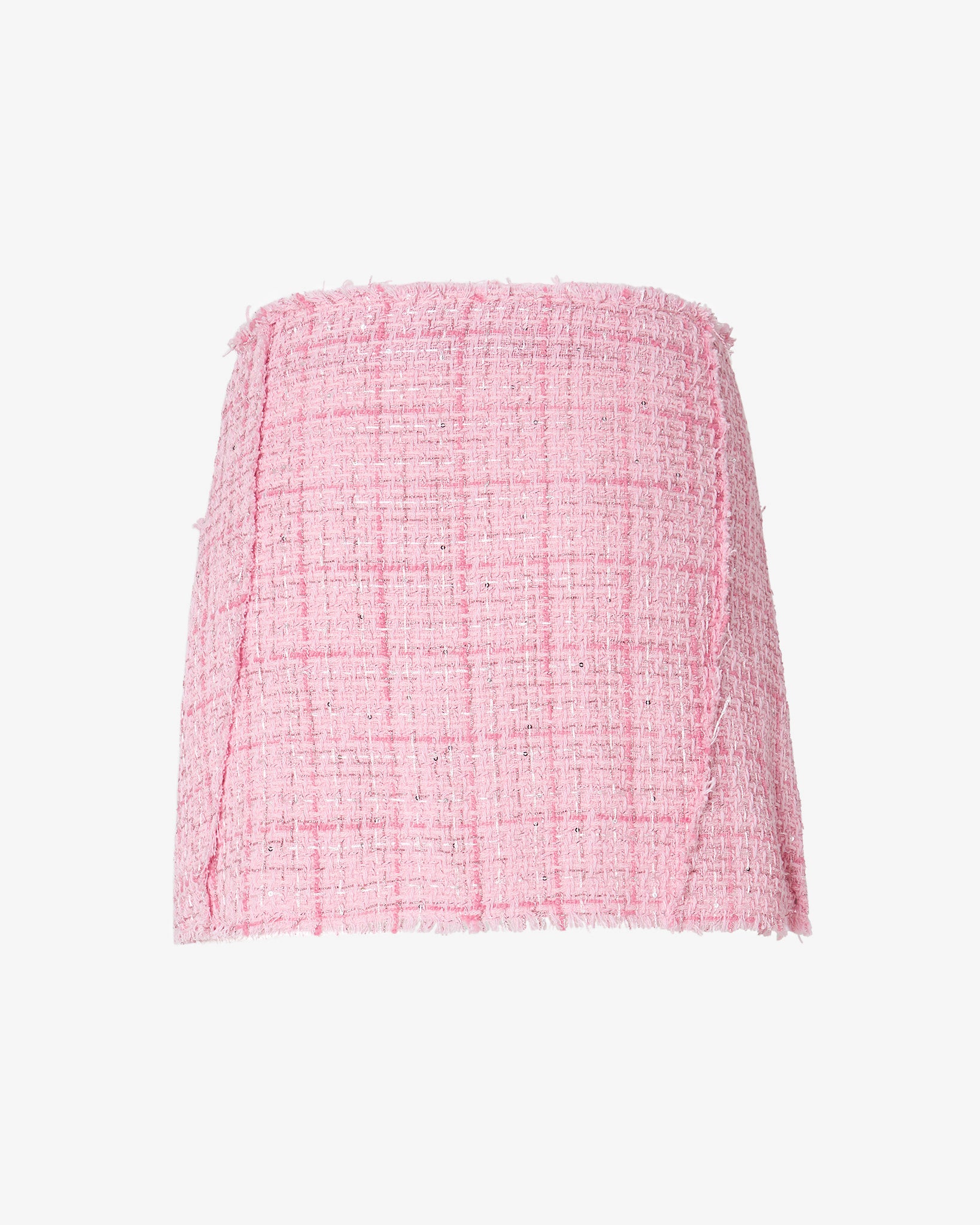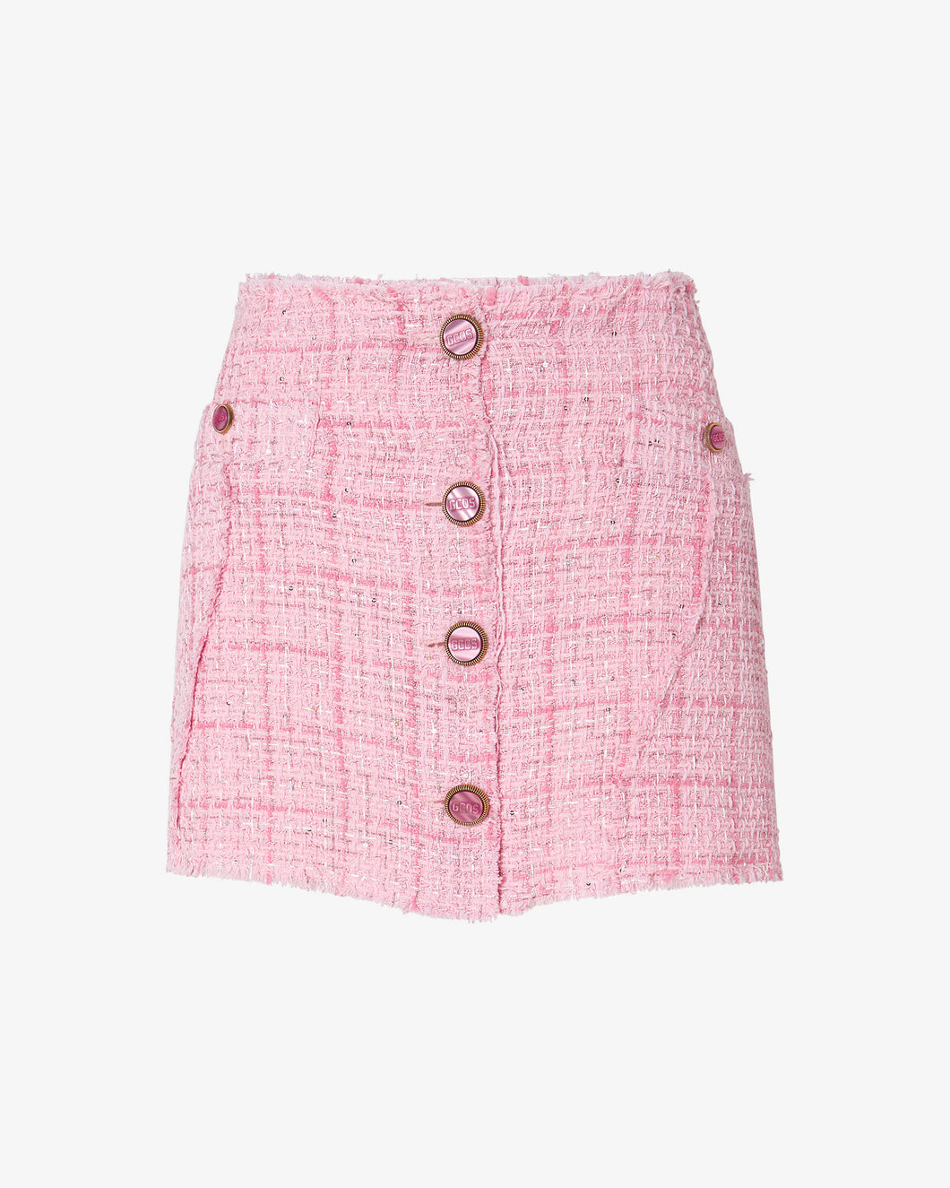 Mini skirt in a feminine silhouette made from cotton-blend tweed, embellished with bright sequins. Front closure with tone-on-tone nacre logoed buttons.