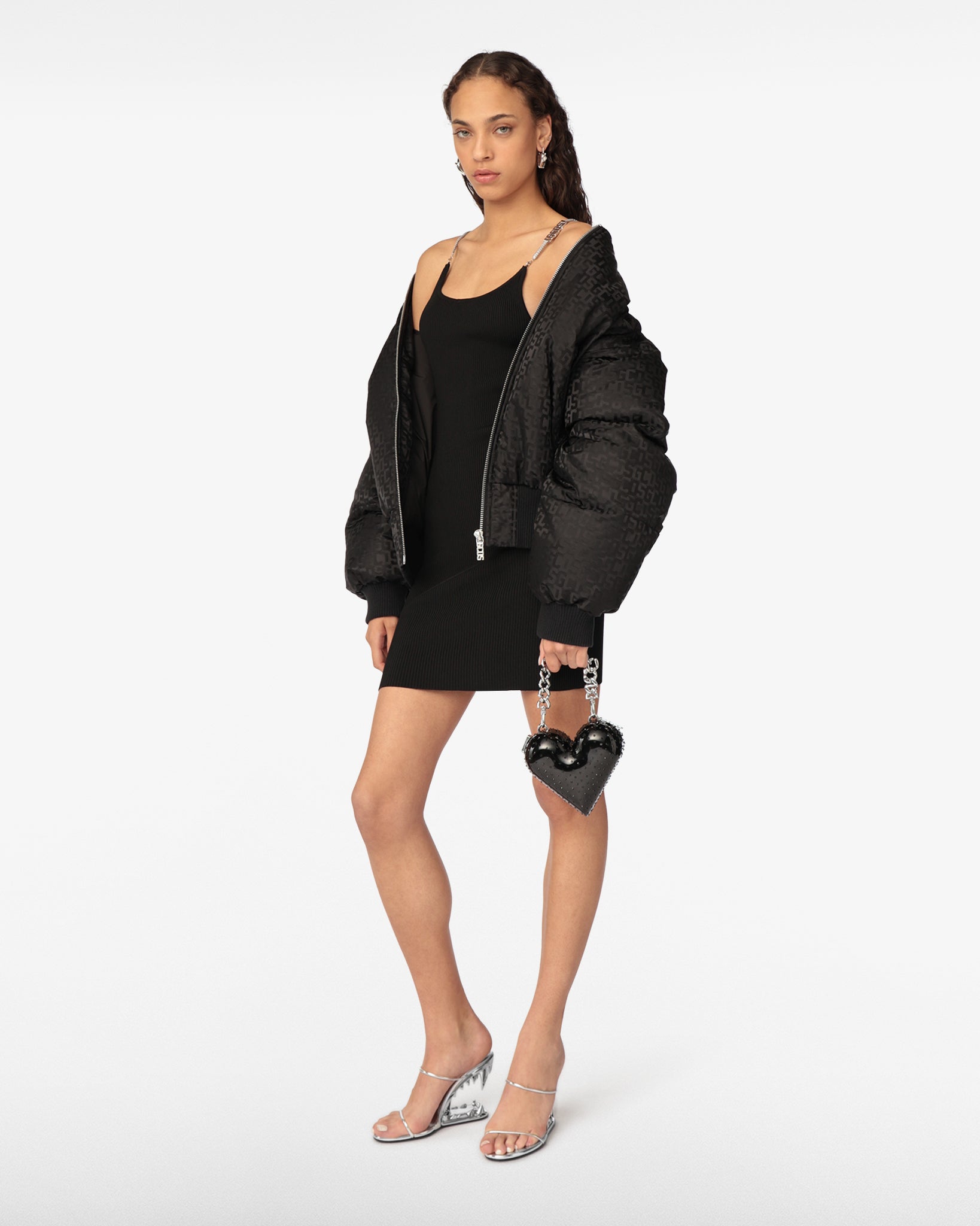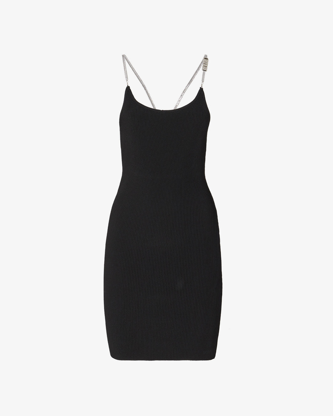Short dress in stretch viscose. Ribbed texture and round neckline. Thin rhinestone straps that embellish the dress, cross at the back, accentuating the deep neckline and giving the dress a sophisticated and elegant touch.