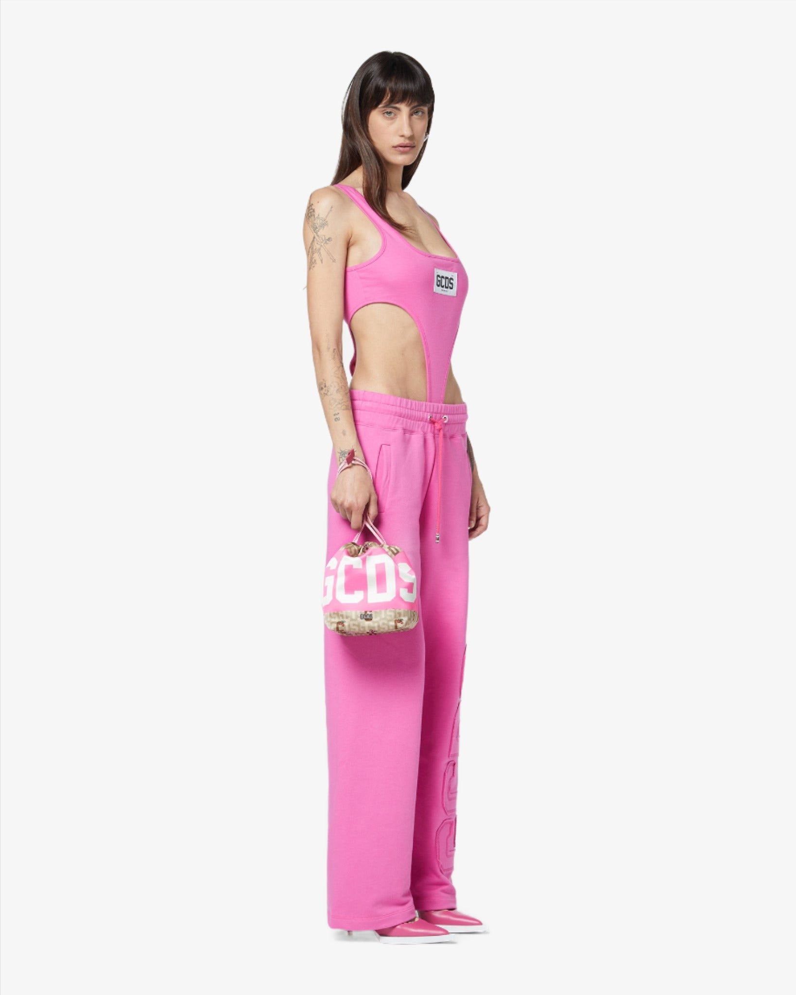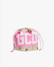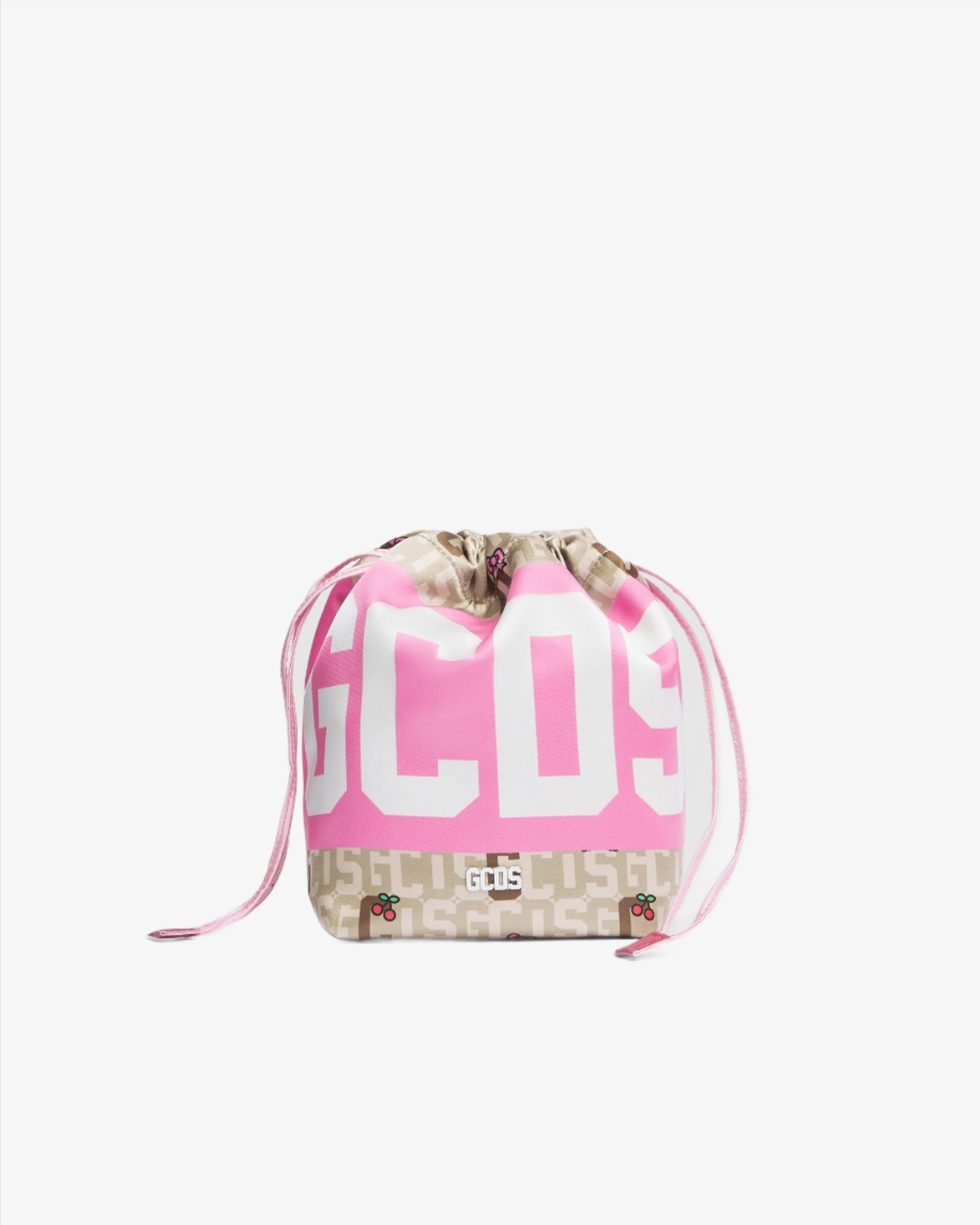 Satin mini bag with GCDS x Hello Kitty monogram pattern. Adjustable cord tie, matching leather turn-ins and cord tie pull. Logo print strap on the front and back. On the inside, leather patch with heat-embossed logo and contrasting jacquard lining.