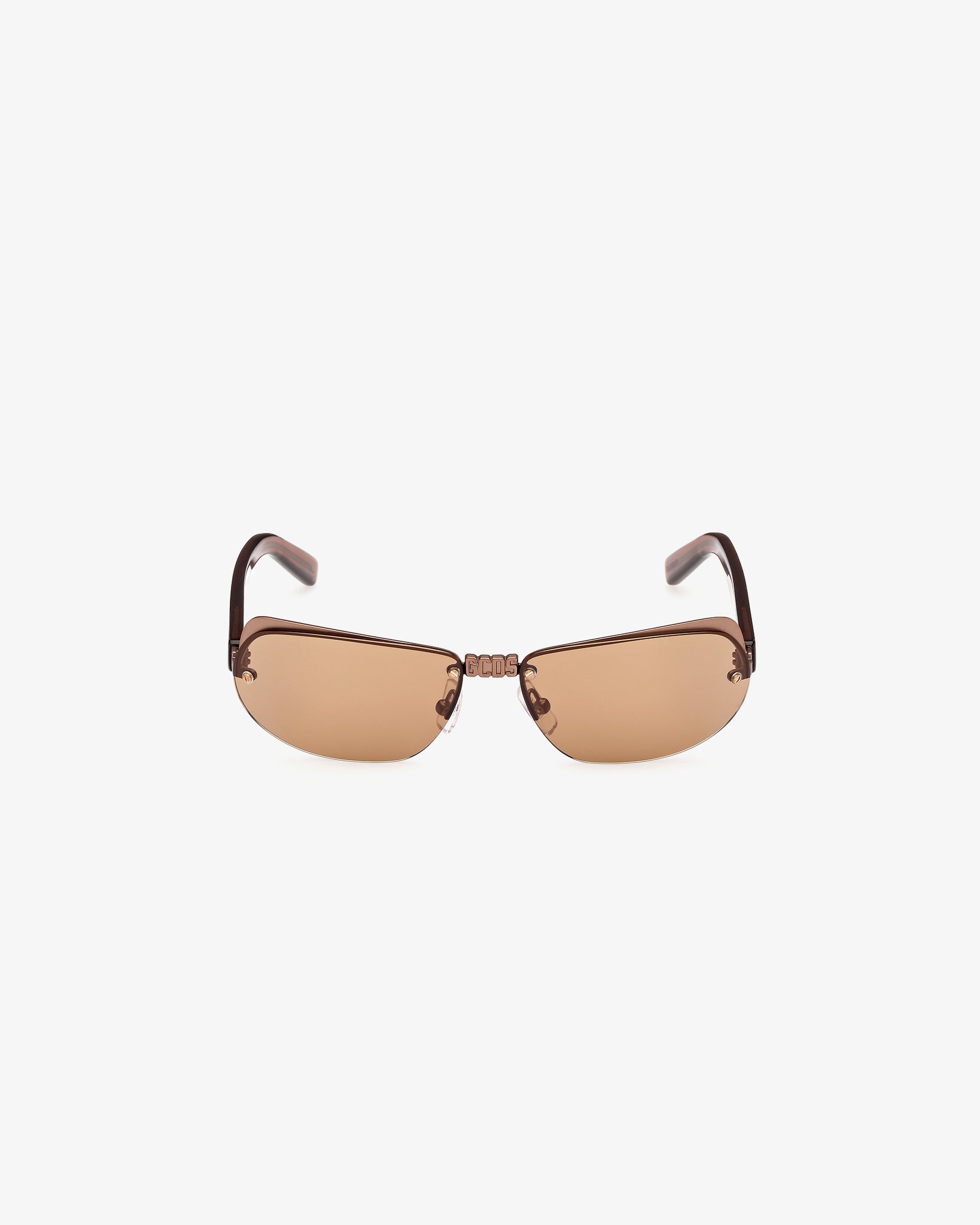 GD0047 is a stylish geometric shape made in metal. Structure with a wrap around attitude, and GCDS logo in the bridge providing an stylish and distinguished look. The transparent temples reveal the metal soul of the sunglasses that connects lenses and temples.