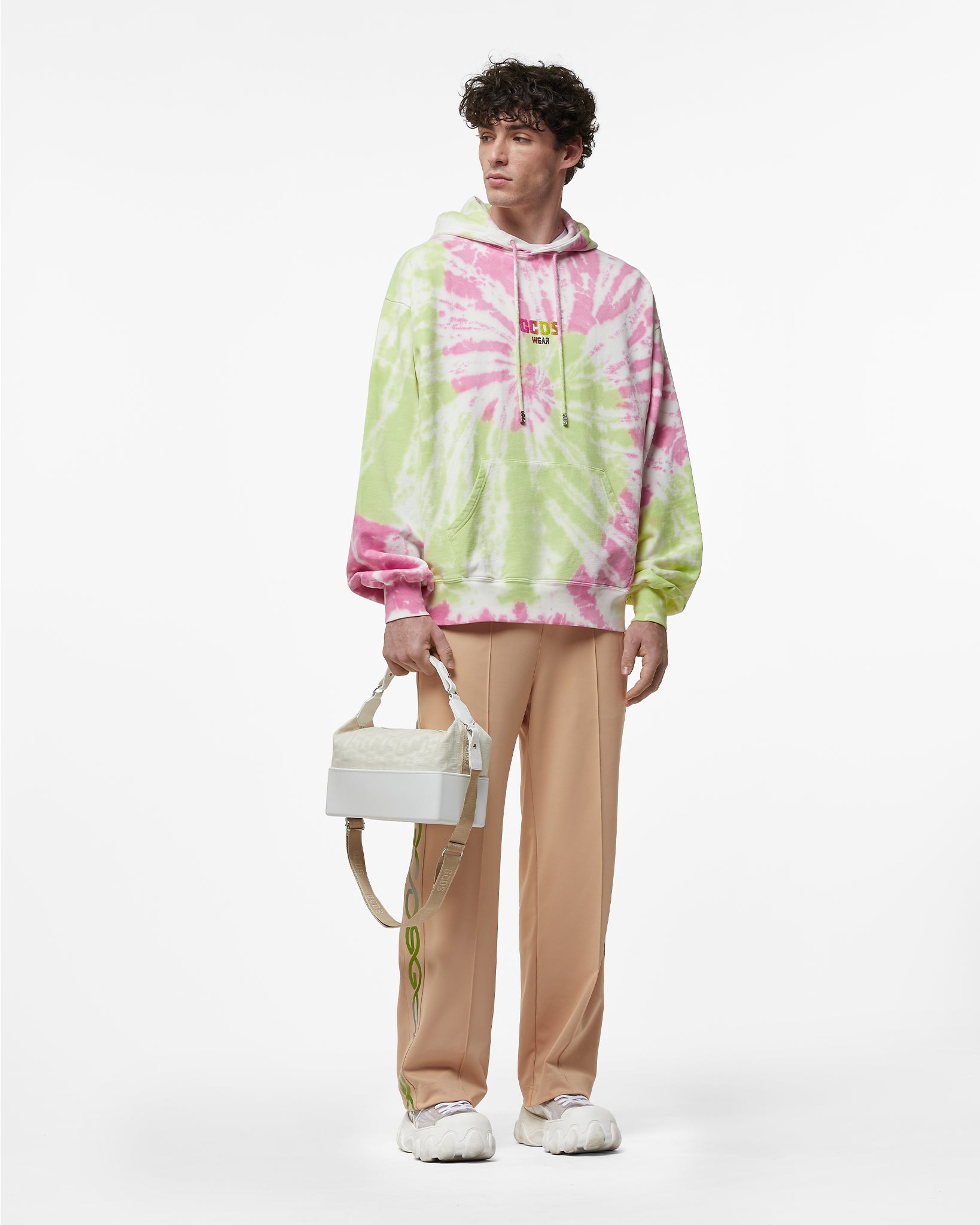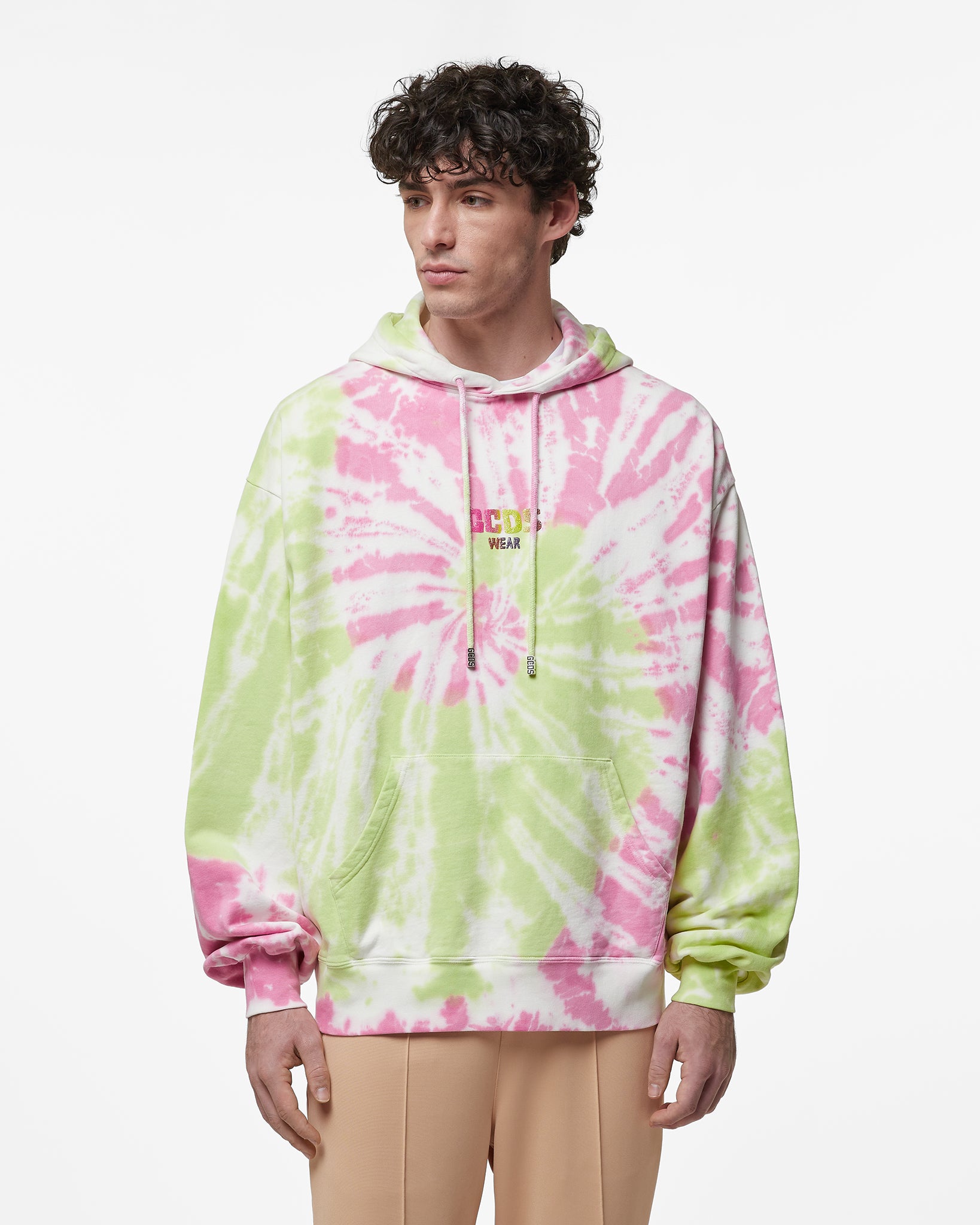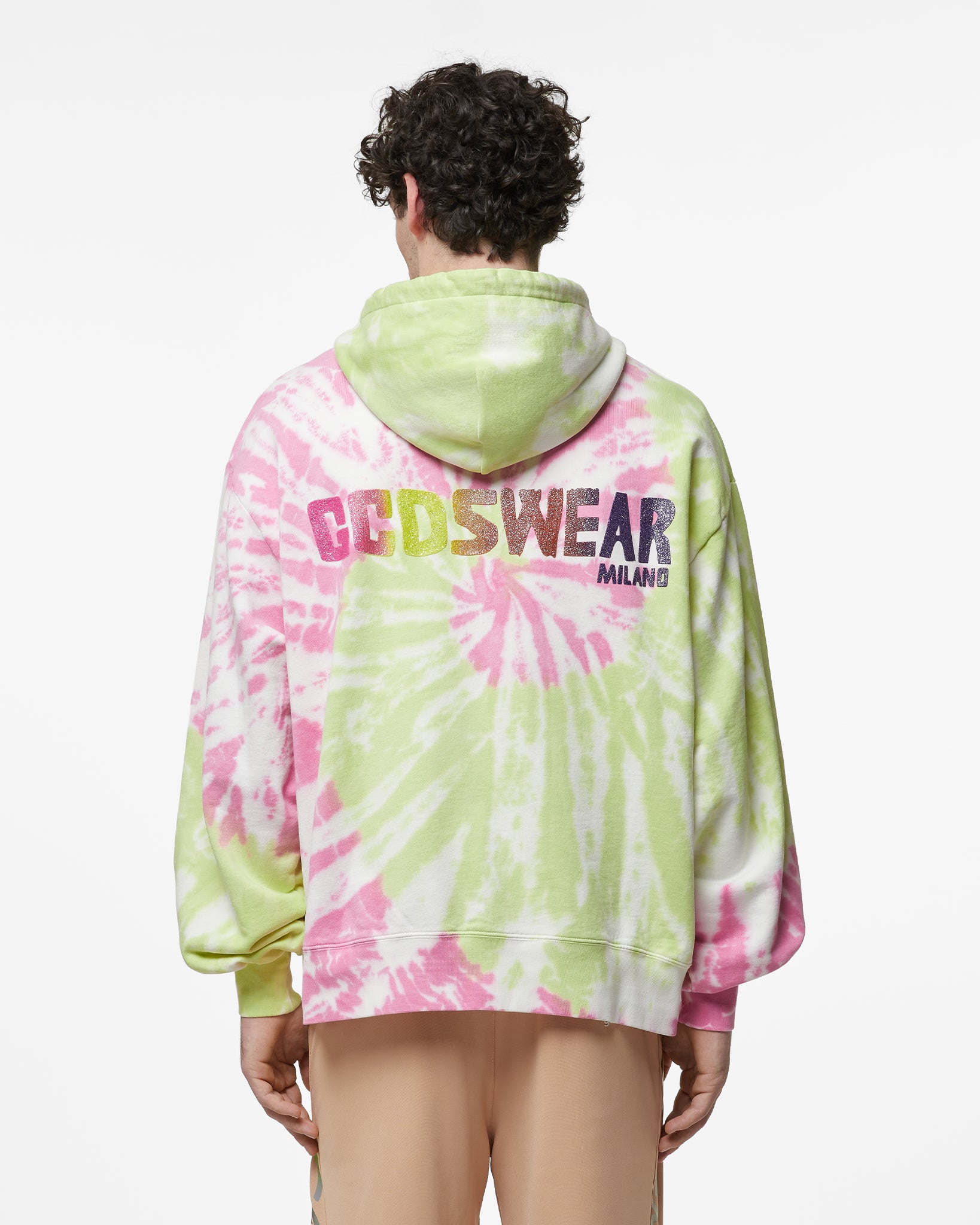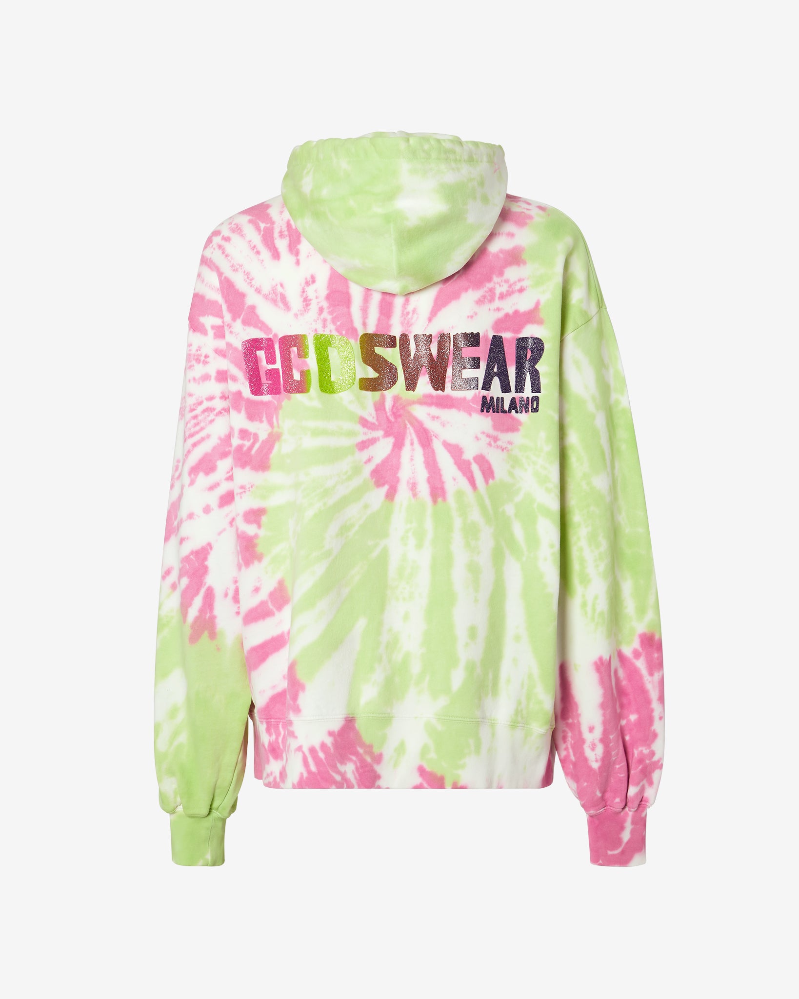 Tie-dyed jersey long-sleeved sweatshirt with adjustable hood. Raised glitter logo print on the front. Oversized fit.