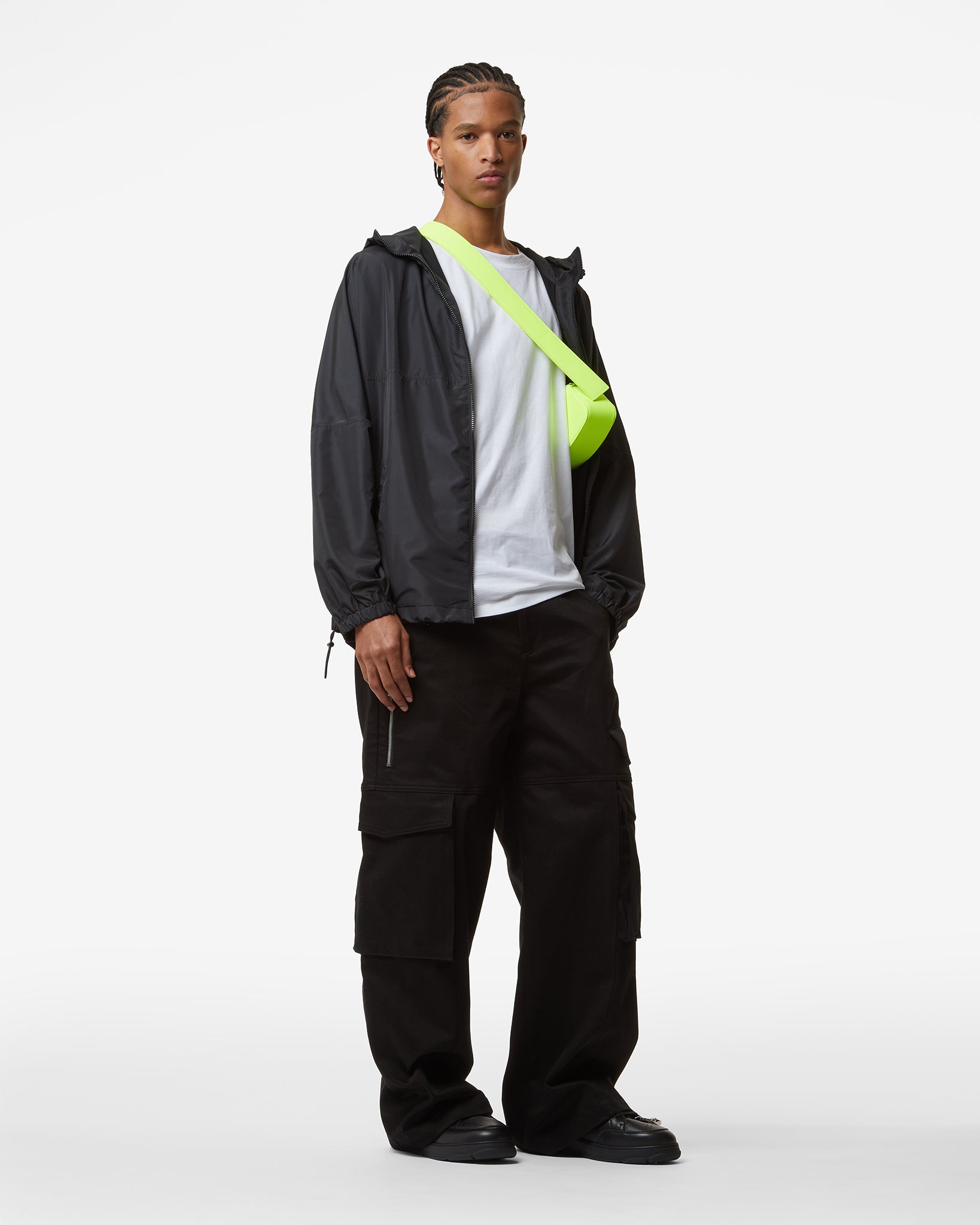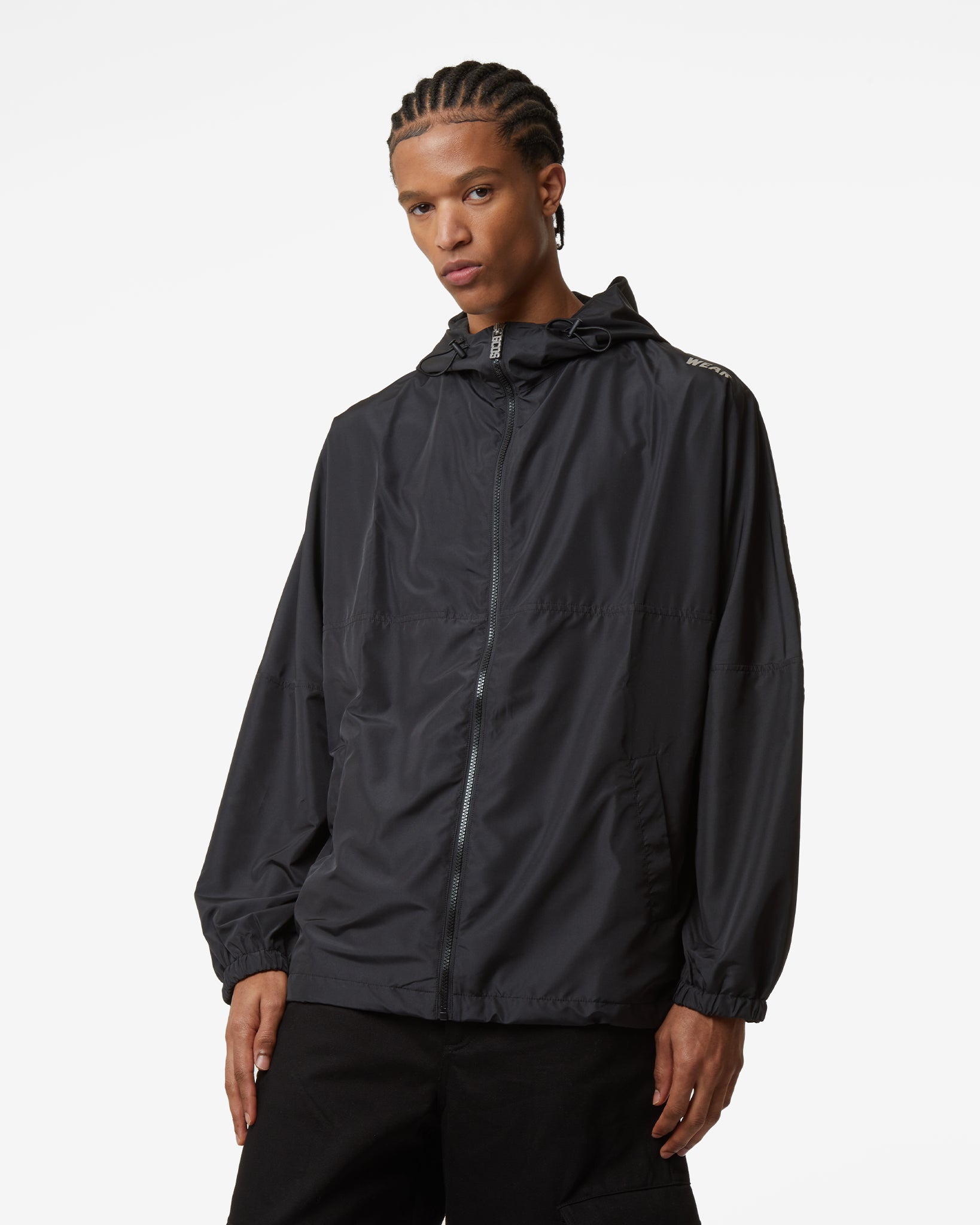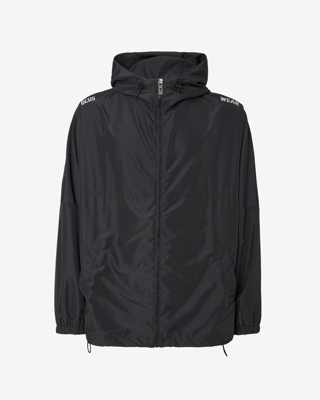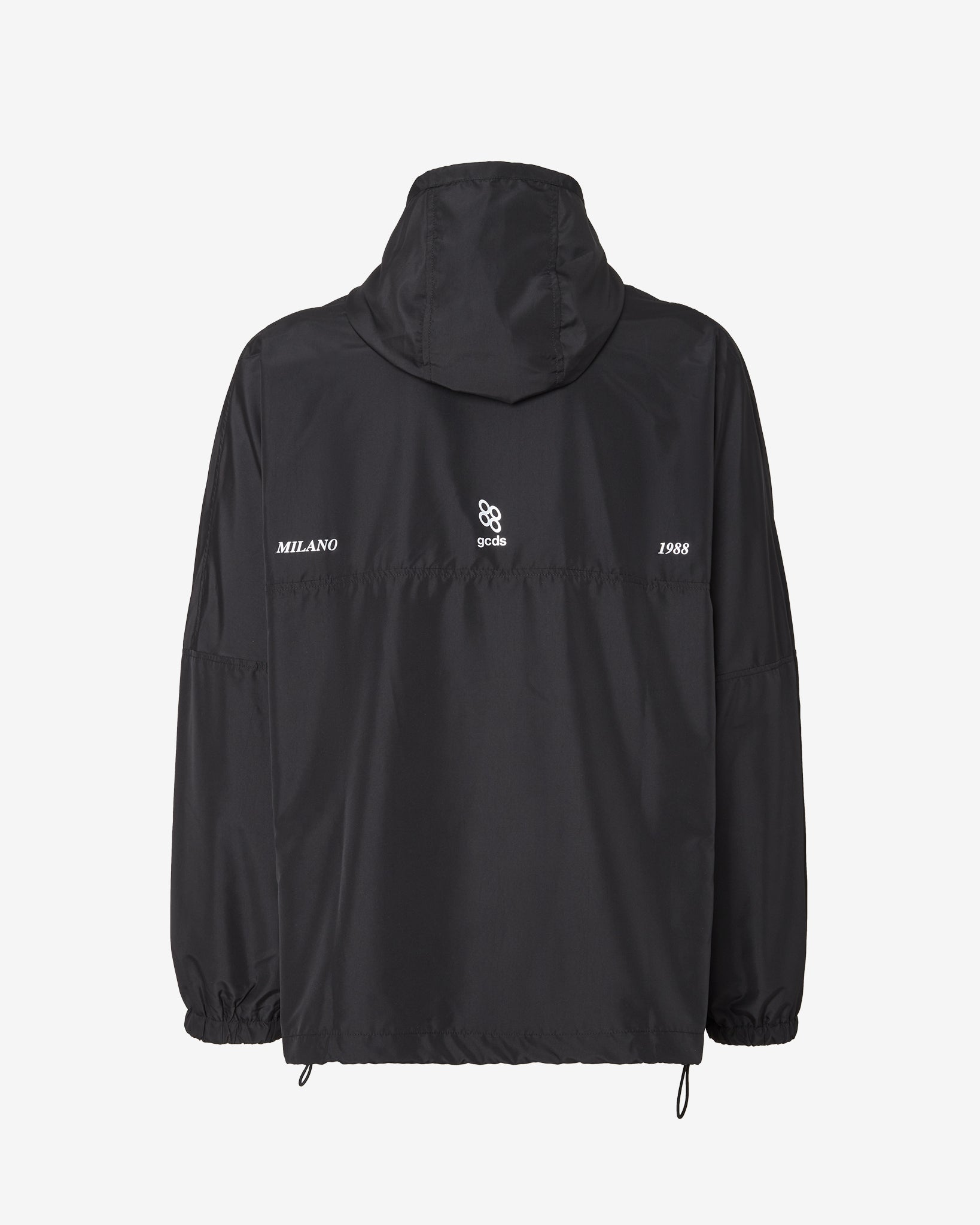 Hooded half zipper anorak featuring reflective prints. Polished nickel "GCDS Bliss" logo plaque. Side welt pockets and maxi pocket on front with hidden snap button. Elastic drawstring with cord clips on neck and hem. Elastic on sleeve bottom.