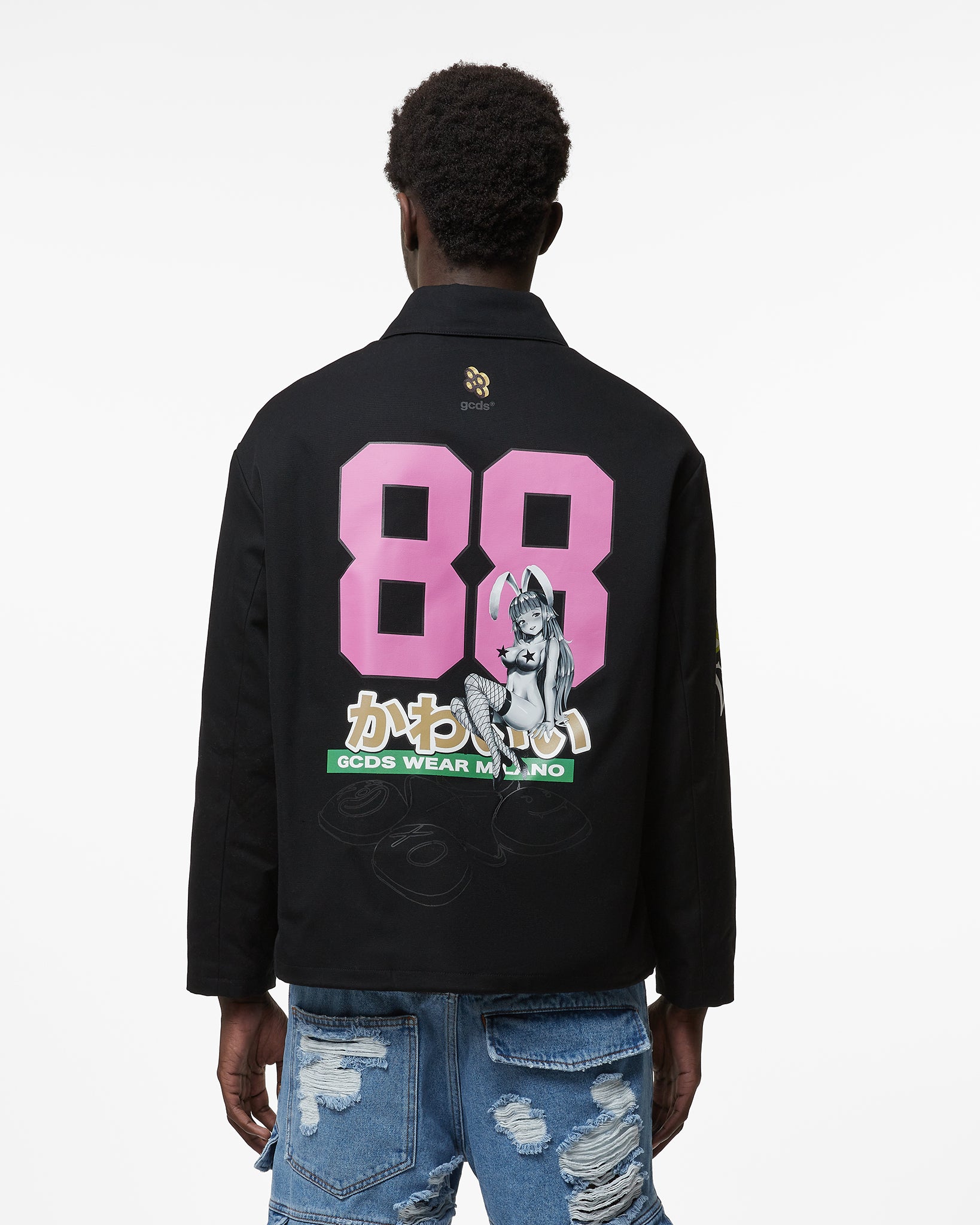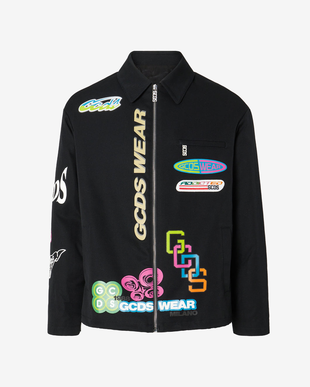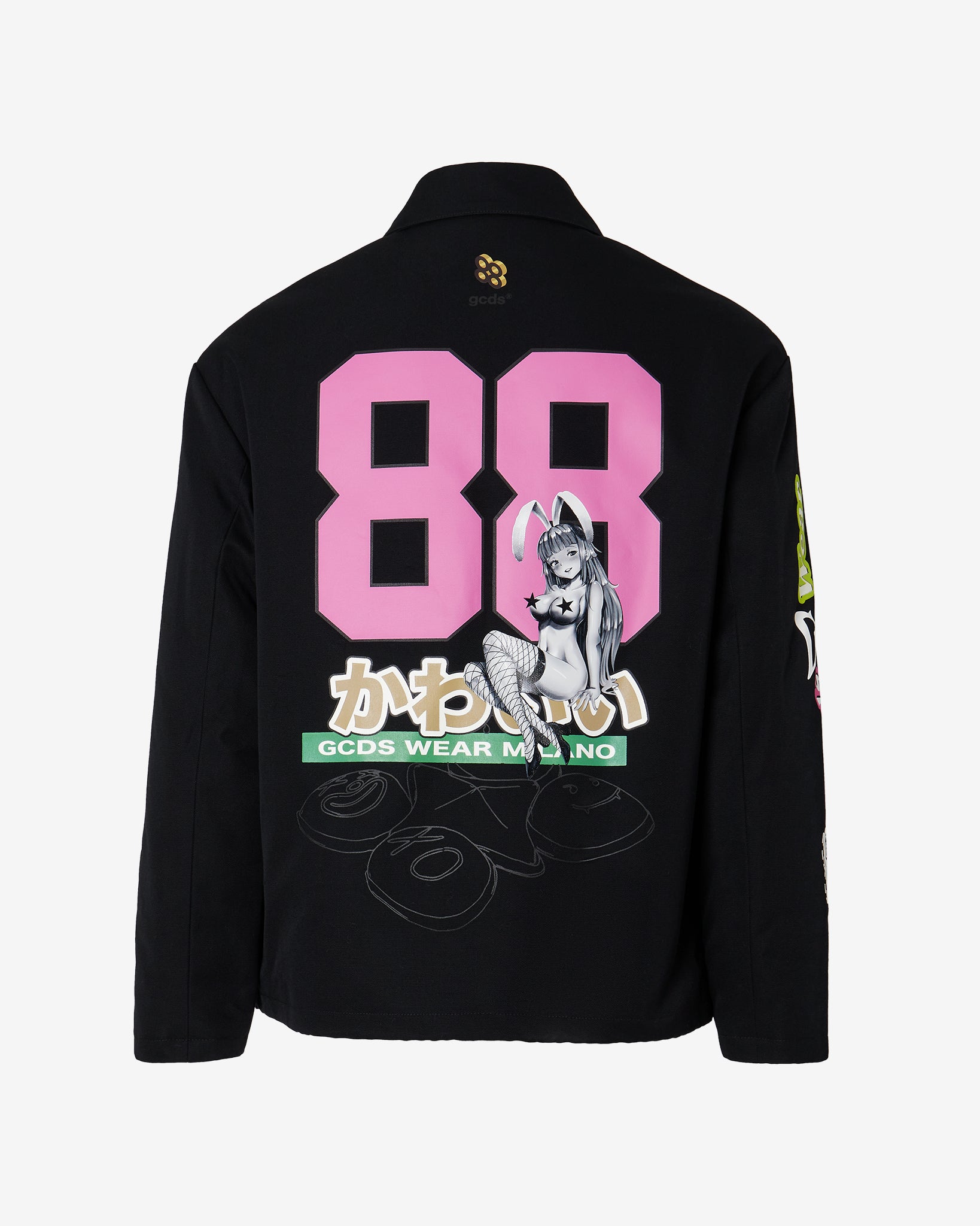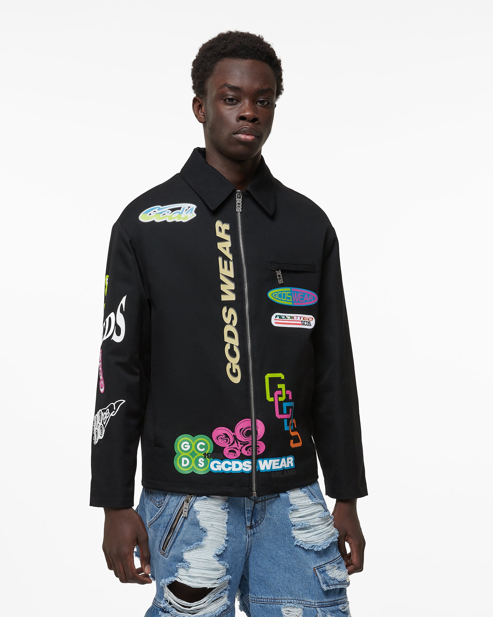 Canvas cotton coach jacket with a mix of printed and embroidered logos. Welt pockets. Elastic around sleeve cuffs. Hidden drawstring at the bottom.
