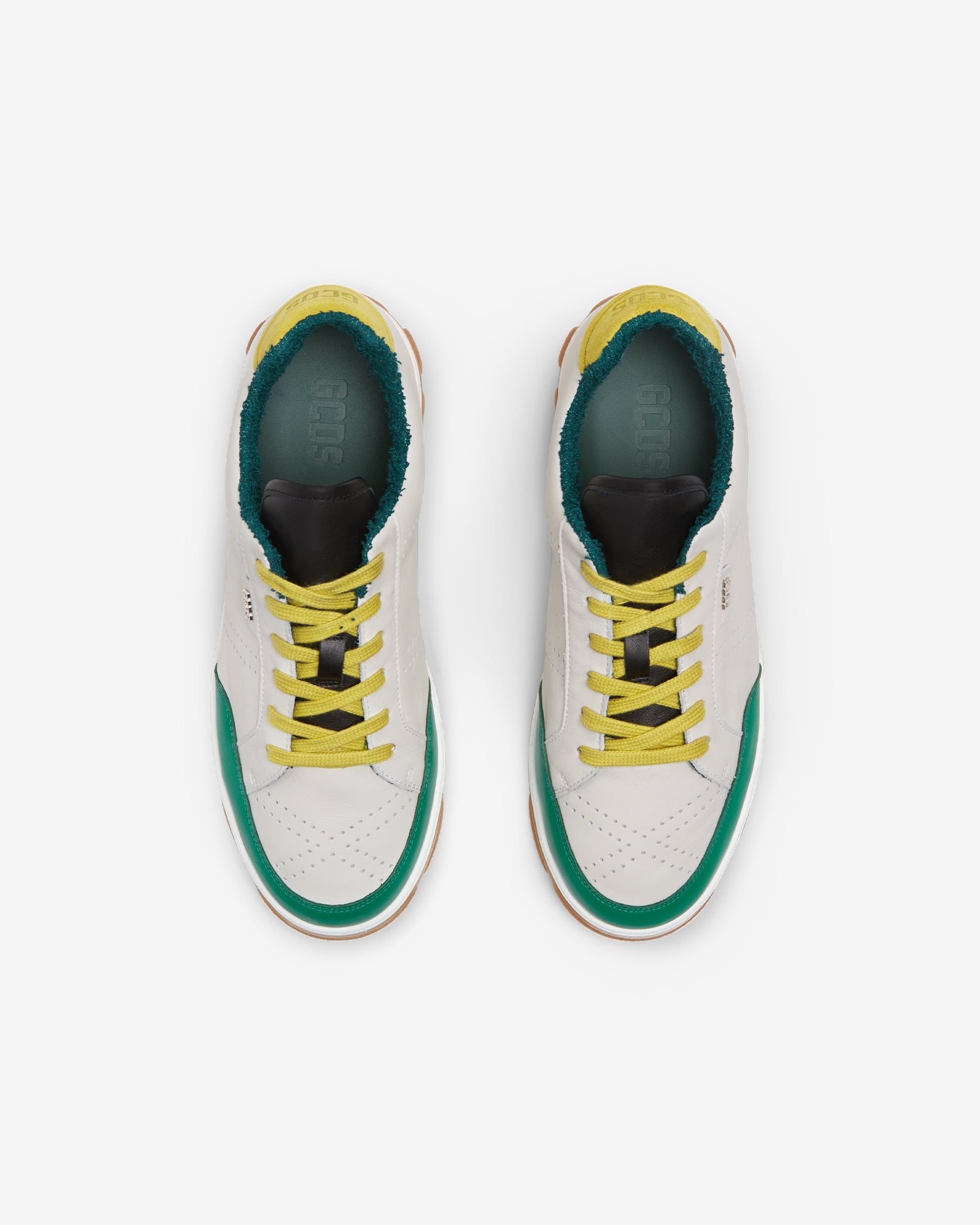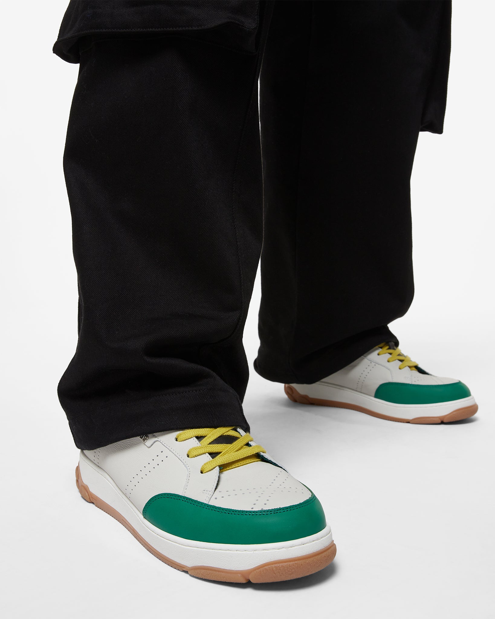 Vintage-inspired low top sneakers with smooth and grained calfskin leather vamp. Iconic X perforations on the toebox and sides of the vamp. Padded tongue. Detailing on the vamp and contrasted tread. Small spoiler on the side of the vamp with polished nickel logo plaque. Leather-covered Fussbett with heat-printed logo. Inner cotton terry cloth lining.