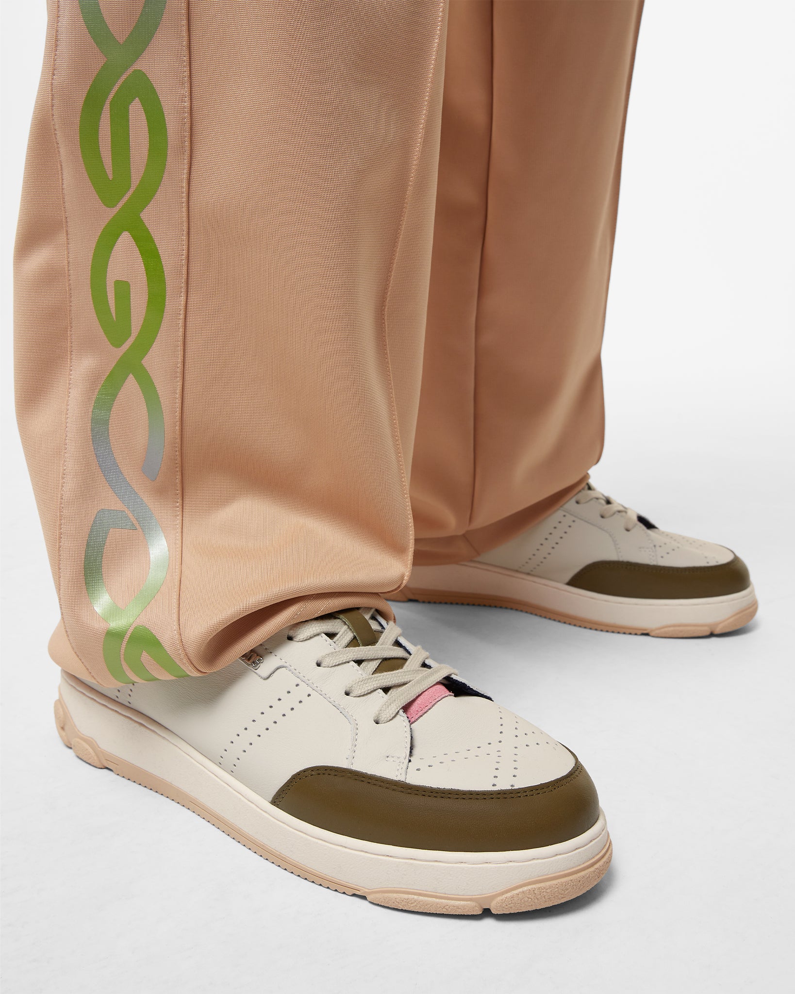 Vintage-inspired low top sneakers with smooth and grained calfskin leather vamp. Iconic X perforations on the toebox and sides of the vamp. Padded tongue. Detailing on the vamp and contrasted tread. Small spoiler on the side of the vamp with polished nickel logo plaque. Leather-covered Fussbett with heat-printed logo. Inner cotton terry cloth lining.