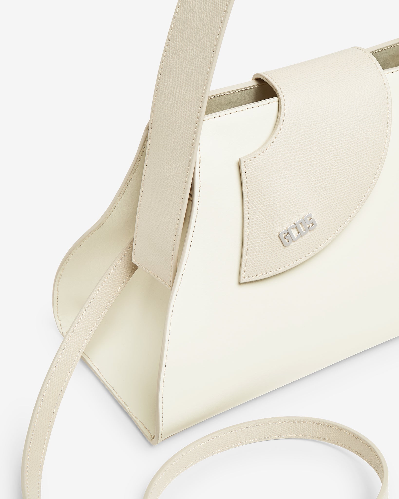 Large flare-shaped smooth calfskin leather comma bag. Contrasted grained leather asymmetrical curved flap with polished nickel GCDS logo on the end and magnetic button. Grained leather handle with semi-hidden snap hooks. Jacquard logo lining and card holder pocket with heat-embossed logo on the inside. Bottom with 5 polished nickel feet.