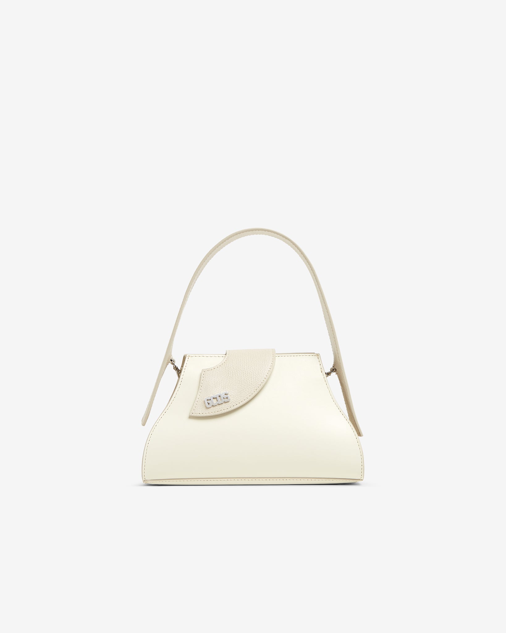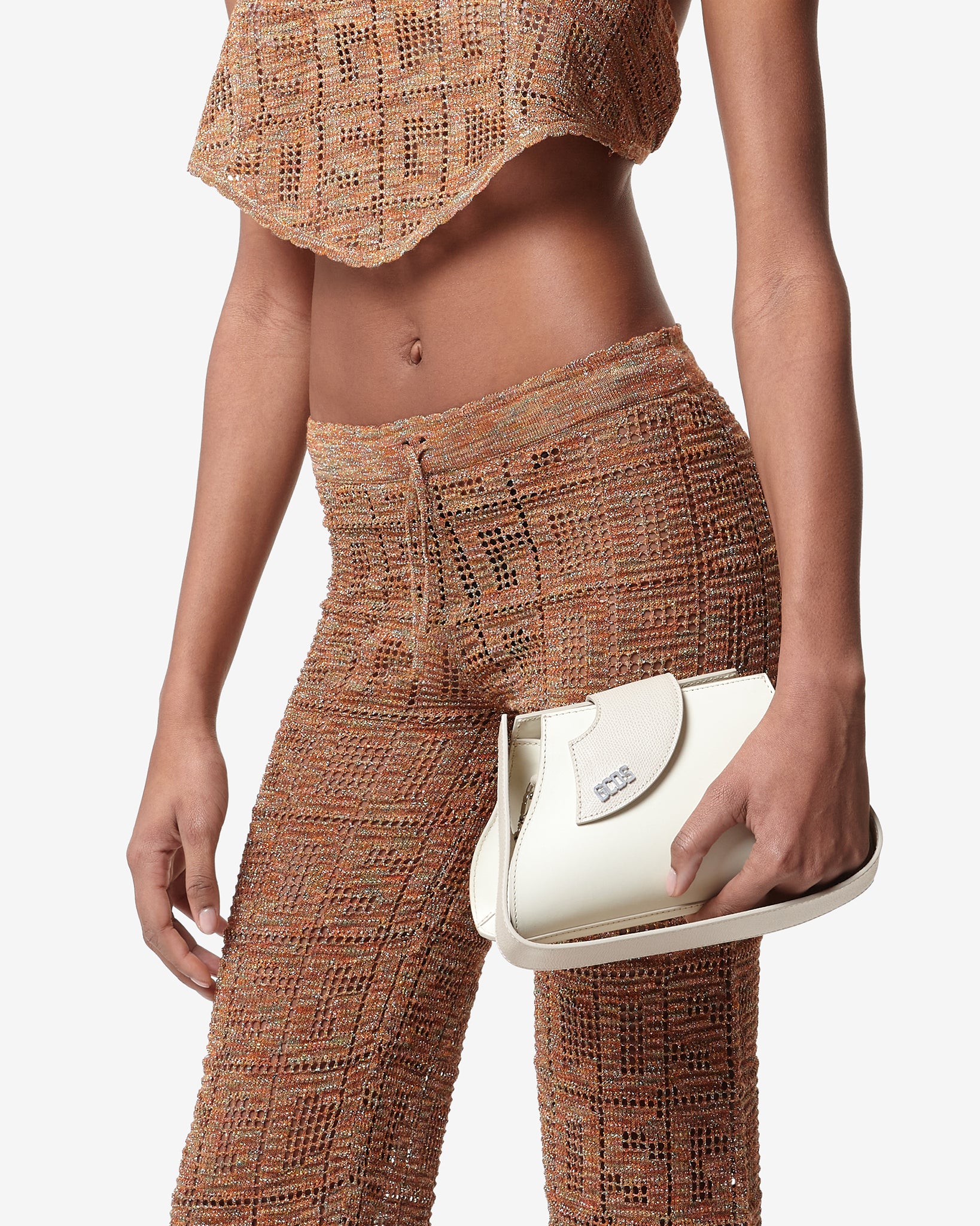 Medium flare-shaped smooth calfskin leather comma bag. Contrasted grained leather asymmetrical curved flap with polished nickel GCDS logo on the end and magnetic button. Grained leather handle with semi-hidden snap hooks. Jacquard logo lining and card holder pocket with heat-embossed logo on the inside. Bottom with 4 polished nickel feet.