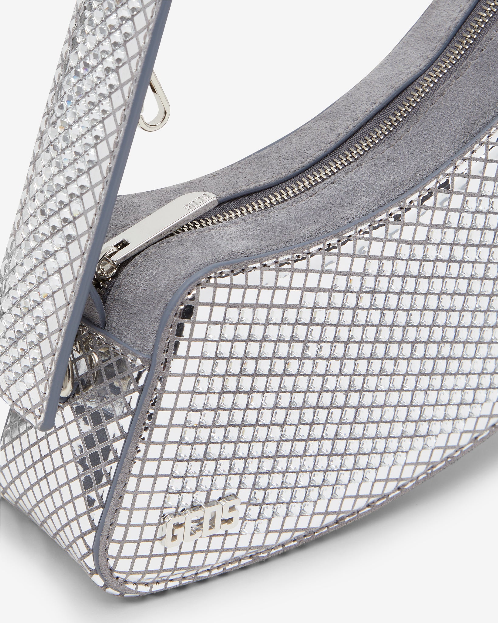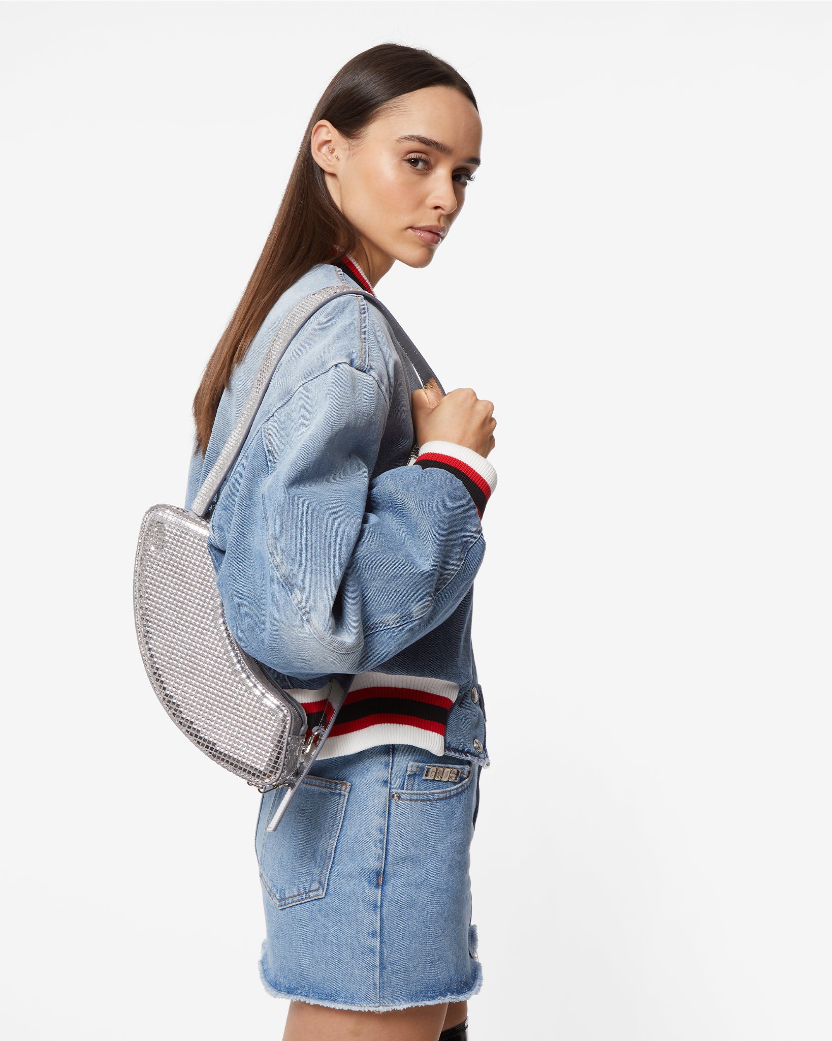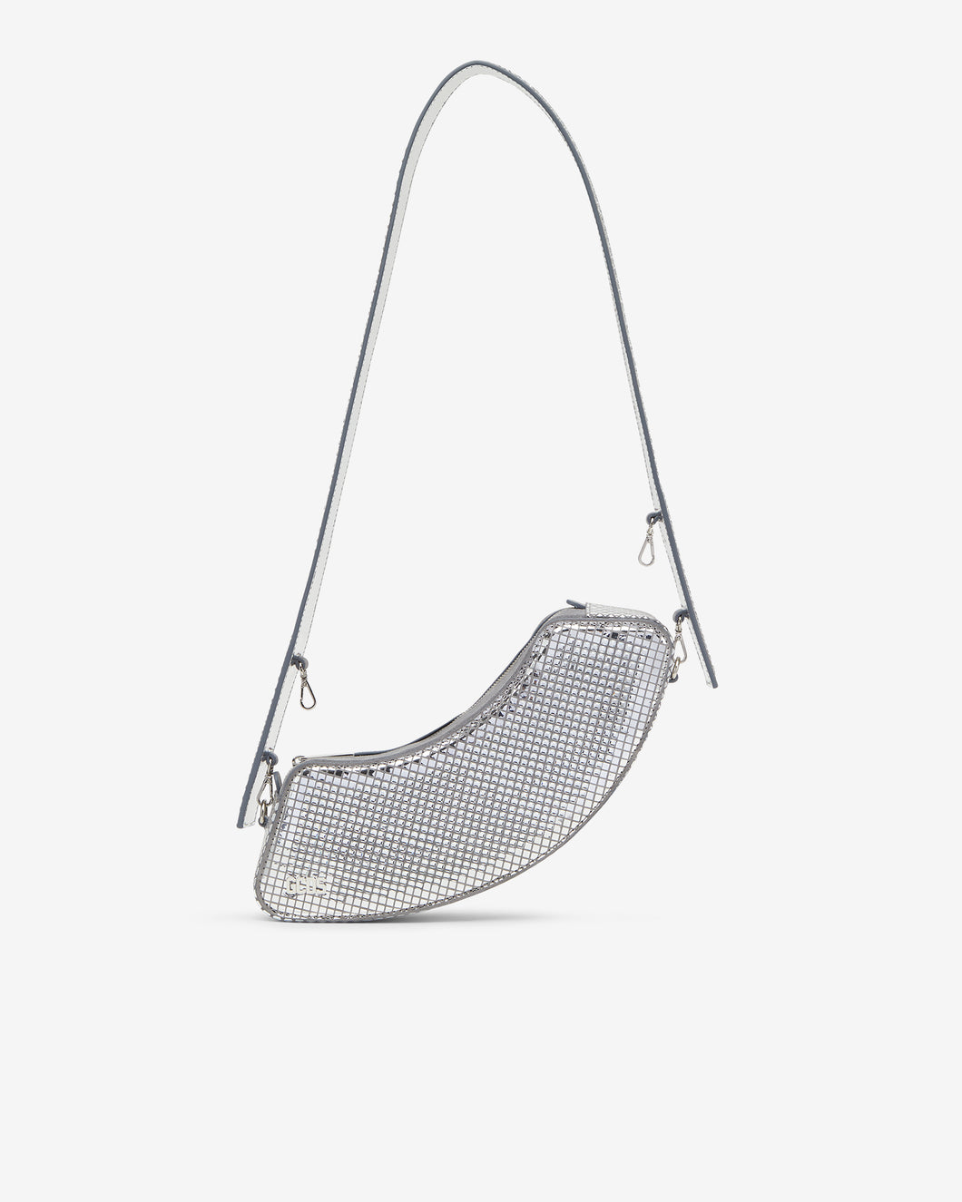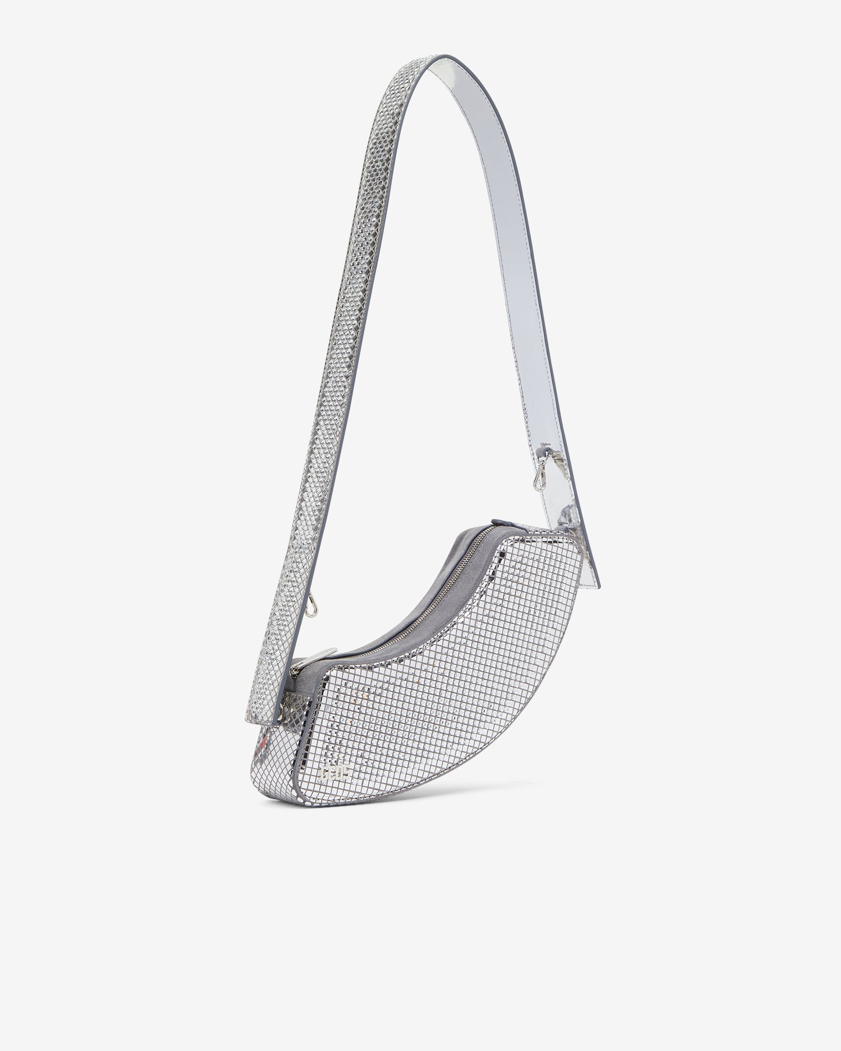 Leather and thermo-application rhinestones medium curve-shaped structured crossbody comma bag. Adjustable strap with 4 semi-hidden snap hooks. Polished nickel logo plaque on the front. Jacquard logo lining and leather trim on the inside.