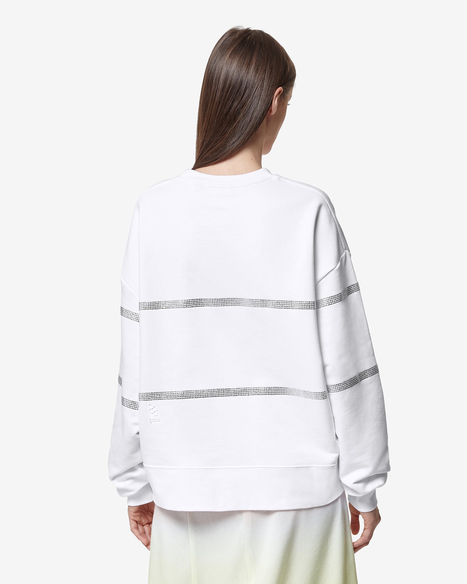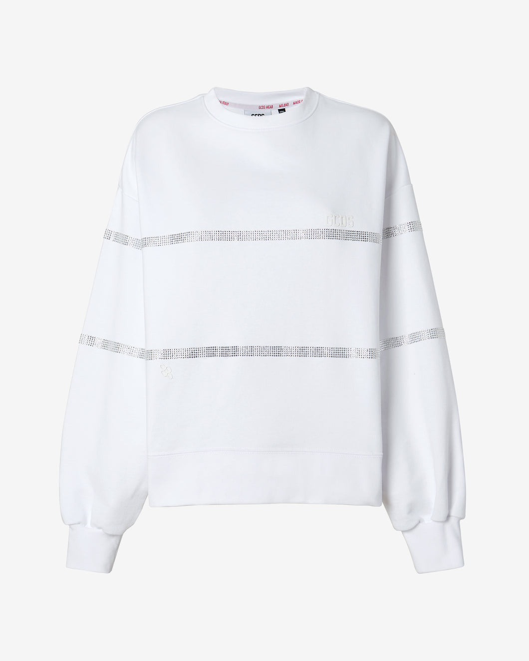 Long-sleeved crew neck cotton sweatshirt with dropped armholes. “GCDS Stripes” artwork and heat-applied rhinestones on the front, back and sleeves. Thick GCDS and “GCDS Bliss” transfer logo print on the front and back. Over-sized.