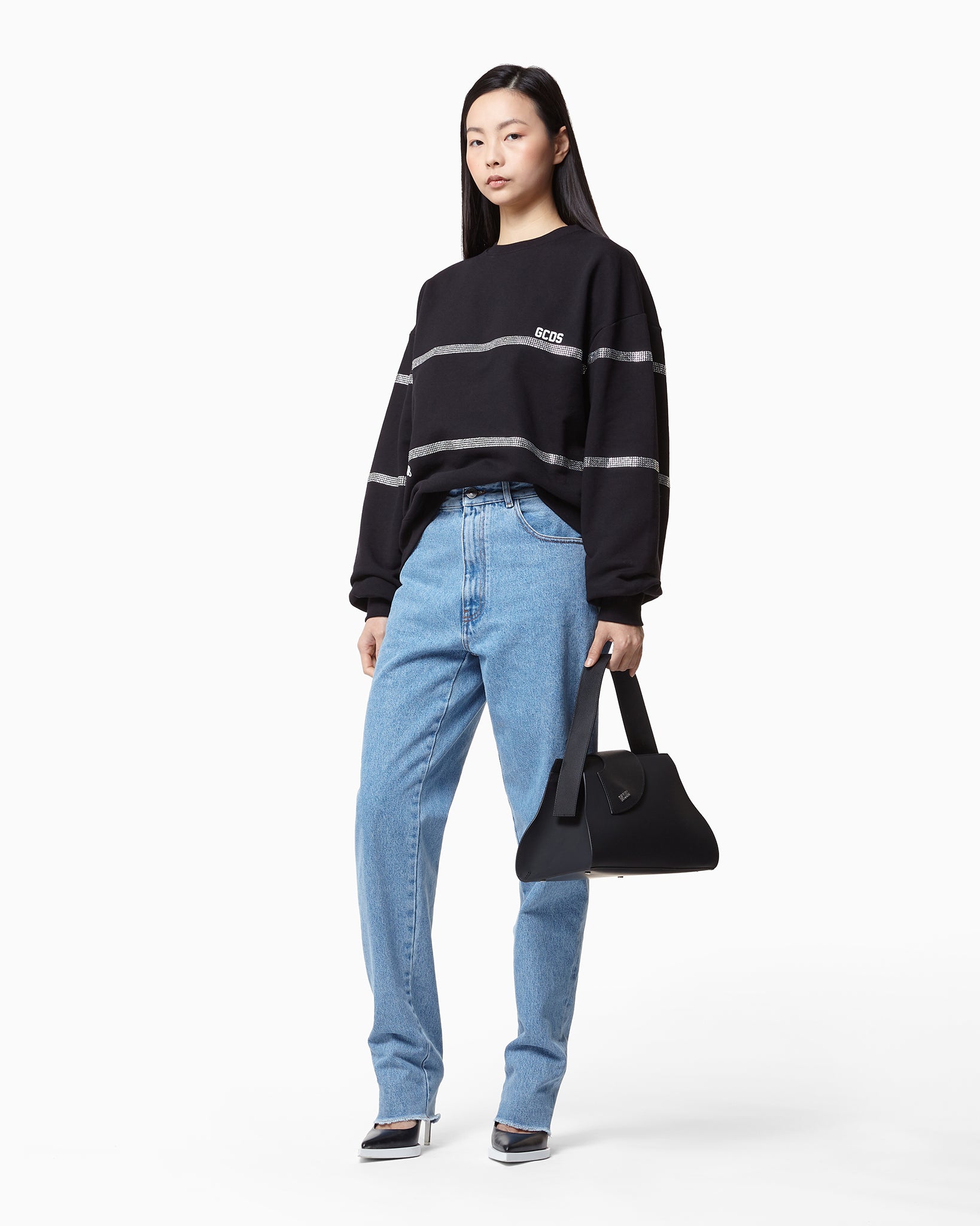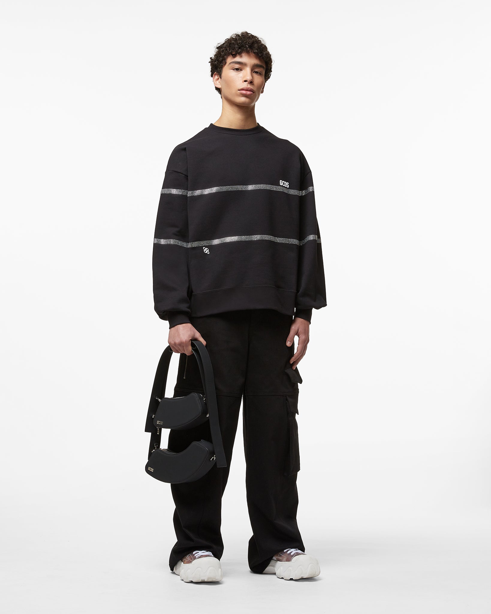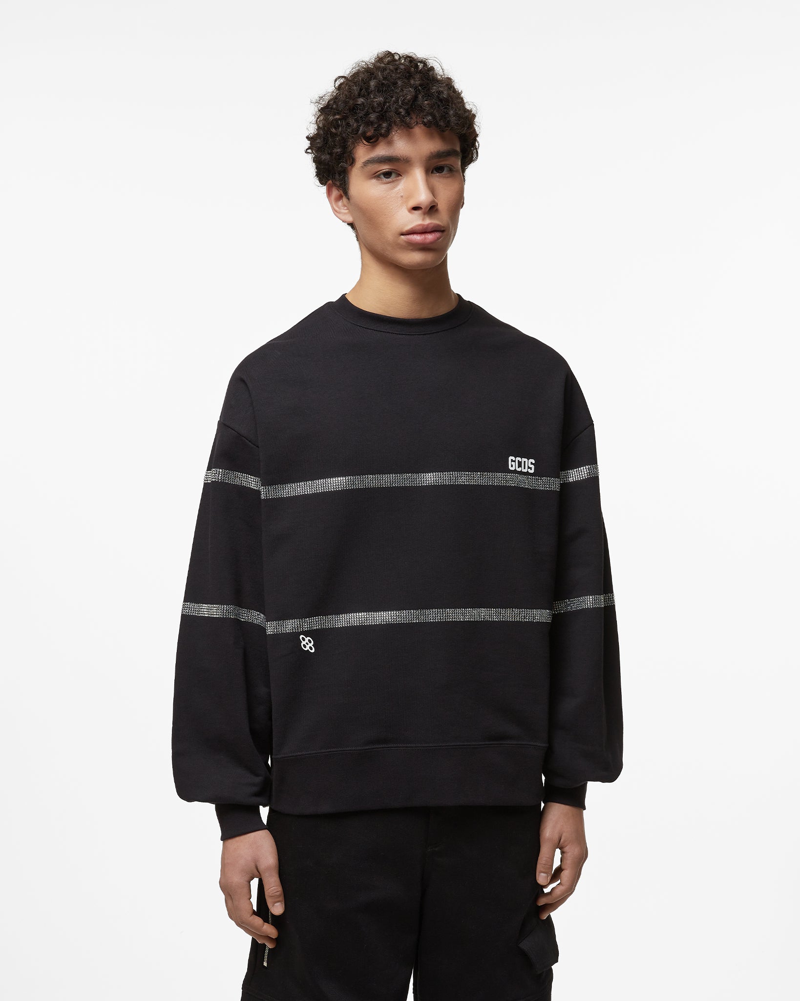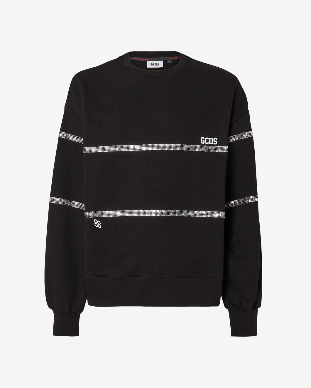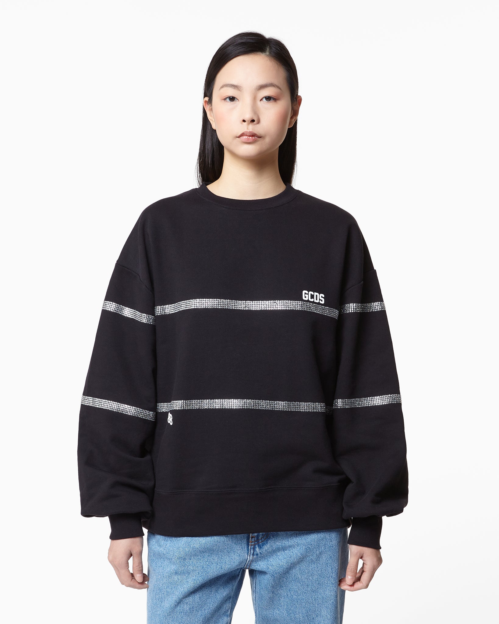 Long-sleeved crew neck cotton sweatshirt with dropped armholes. “GCDS Stripes” artwork and heat-applied rhinestones on the front, back and sleeves. Thick GCDS and “GCDS Bliss” transfer logo print on the front and back. Over-sized.