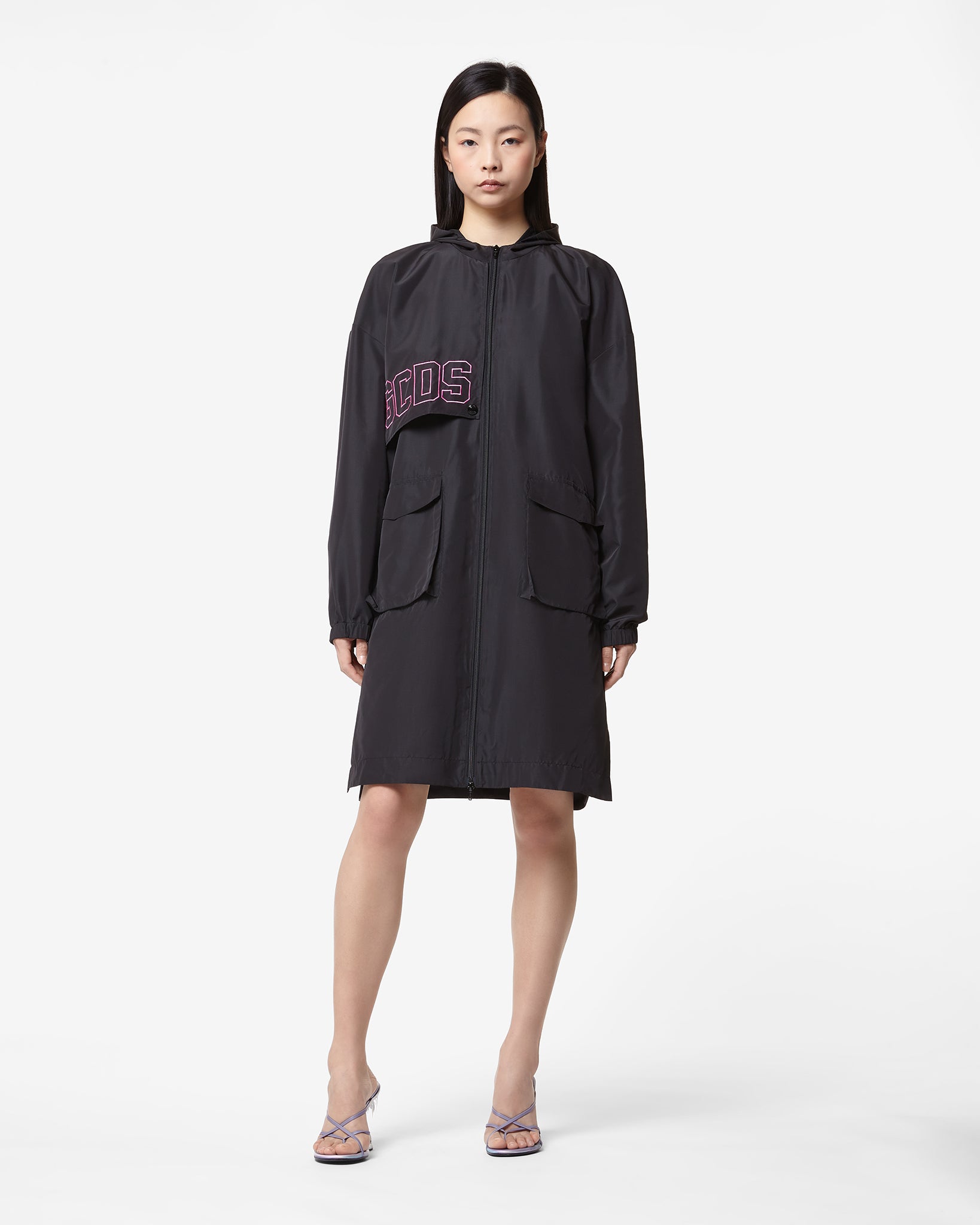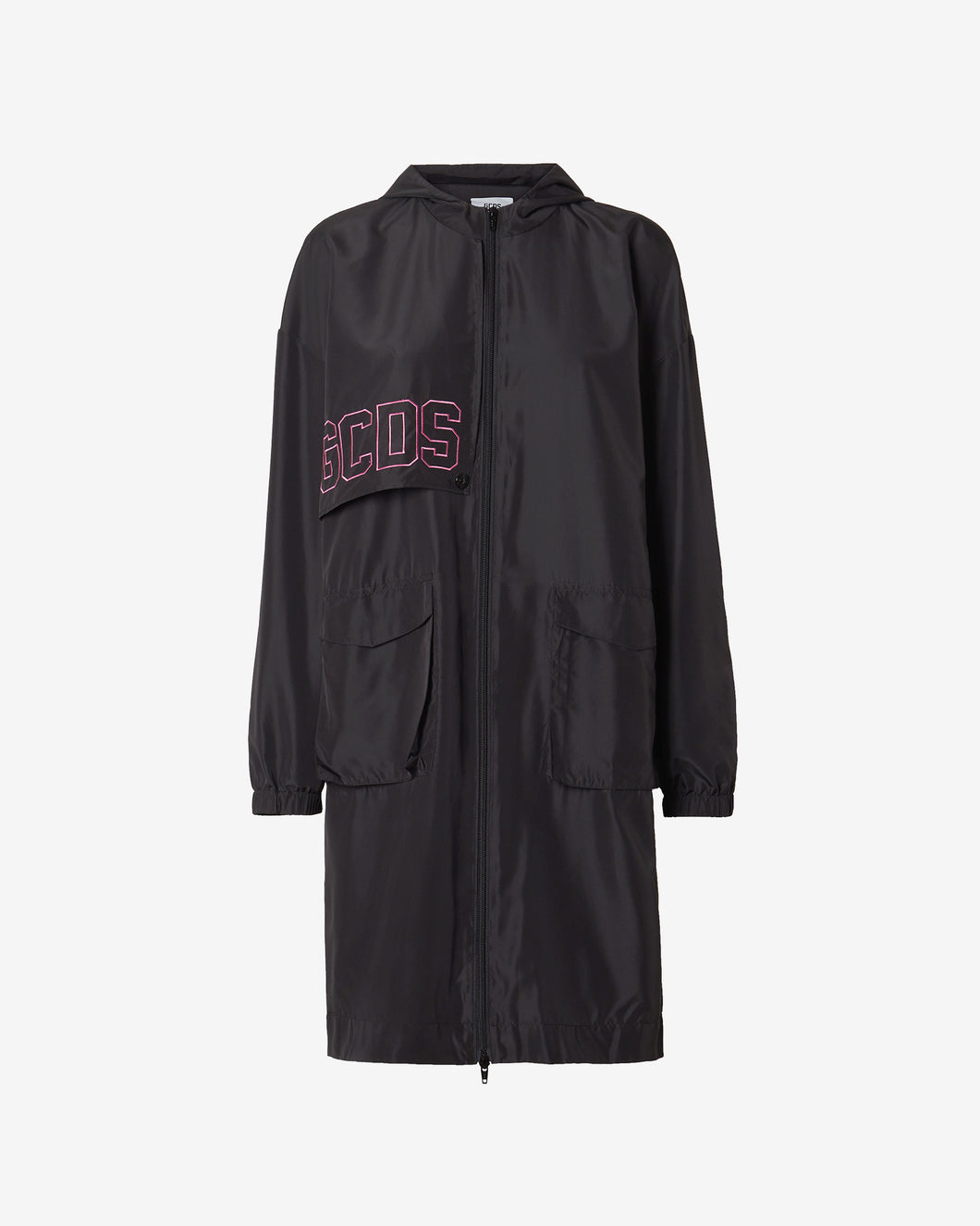 Long nylon anorak with hood and anti-wind flap on the front, decorated with contrasted GCDS logo embroidery. Double pocket with flap on the front. Rubber “GCDS Cuore” patch on the back.