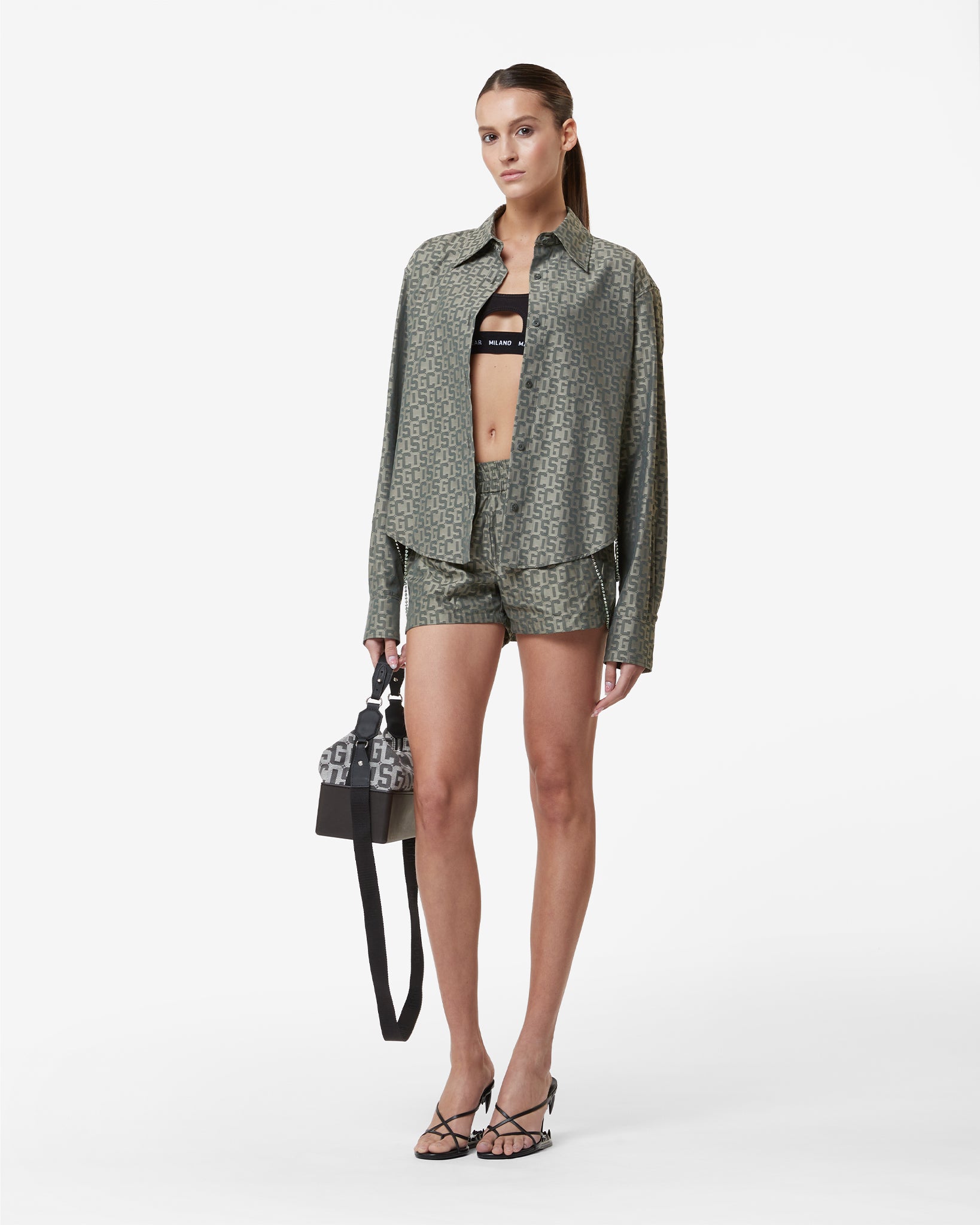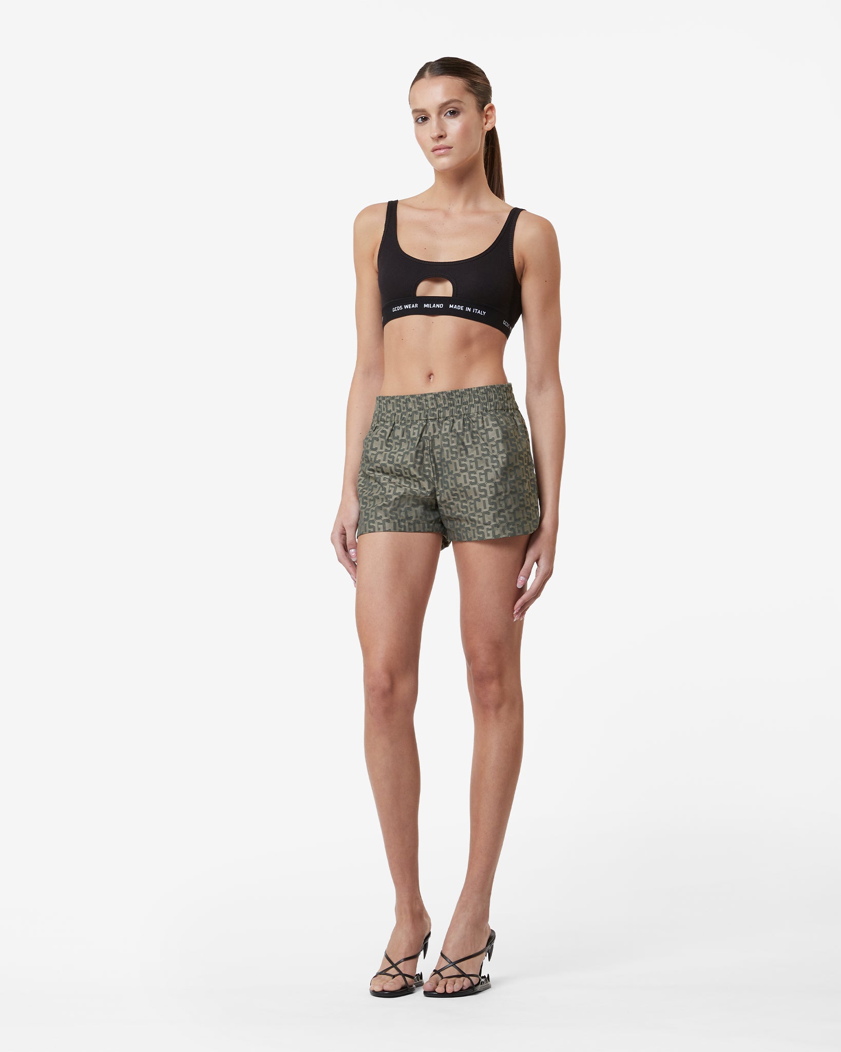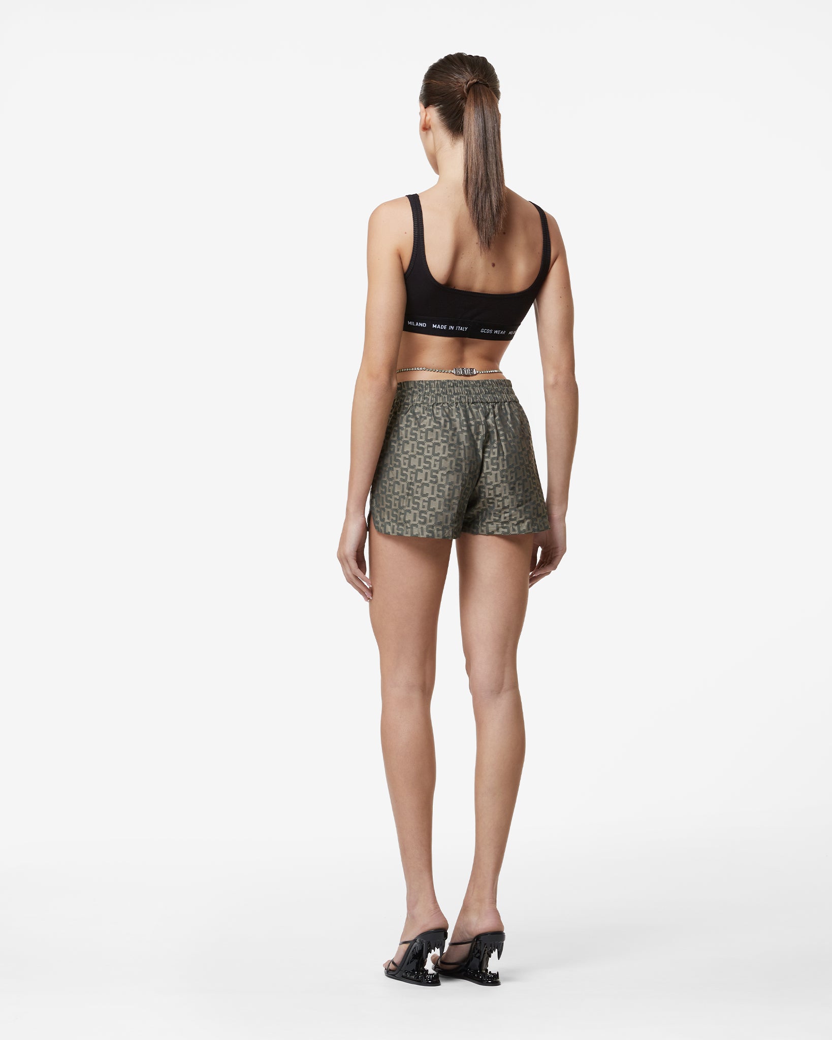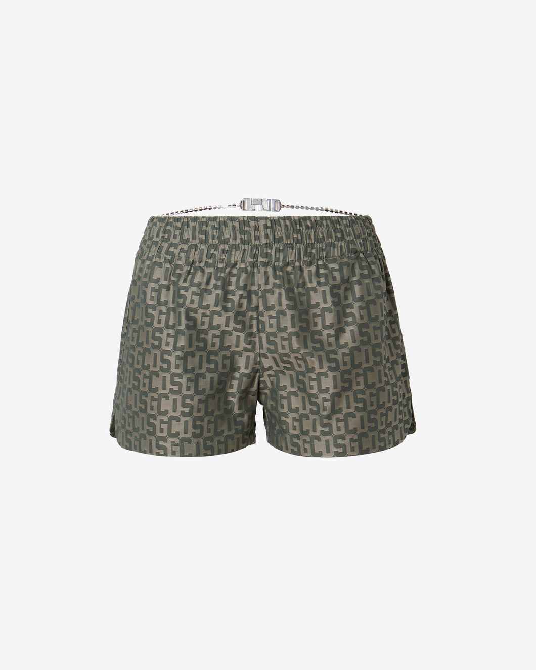 Two-tone monogram GCDS cotton shorts decorated with a cup chain with lace at the waist and a polished nickel logo clip on the back. Rounded bottom with side slits.