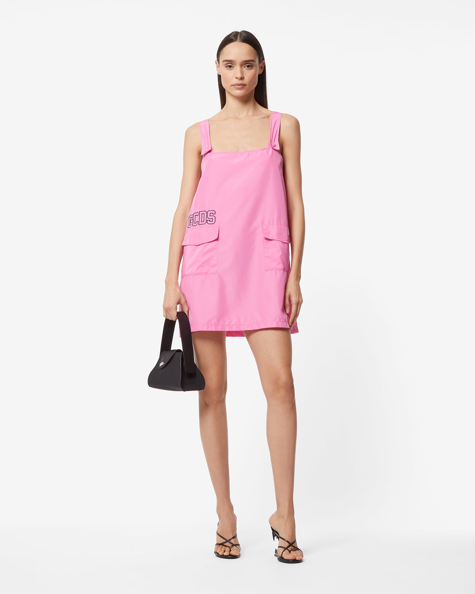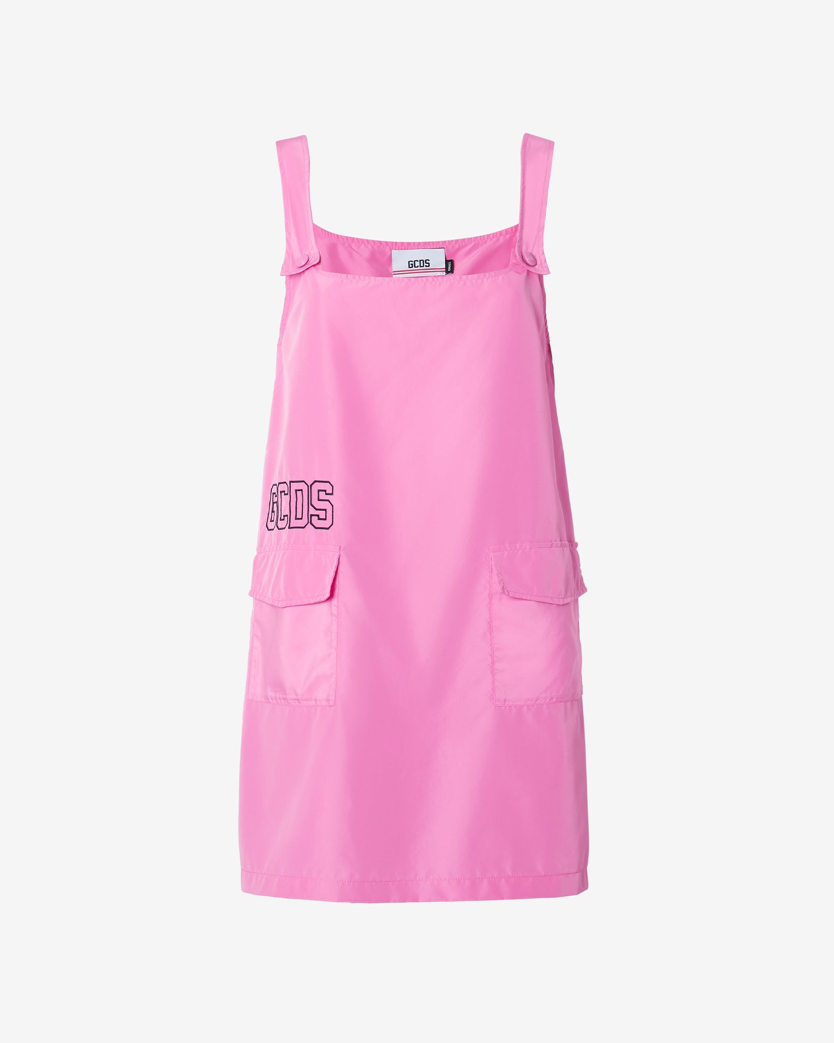 Shirtless nylon mini dress with tone-on-tone logo snap buttons on the straps. Appliqué pocket with flap on the front. Contrasted logo embroidery on the front. Rubber “GCDS Cuore” patch on the back.