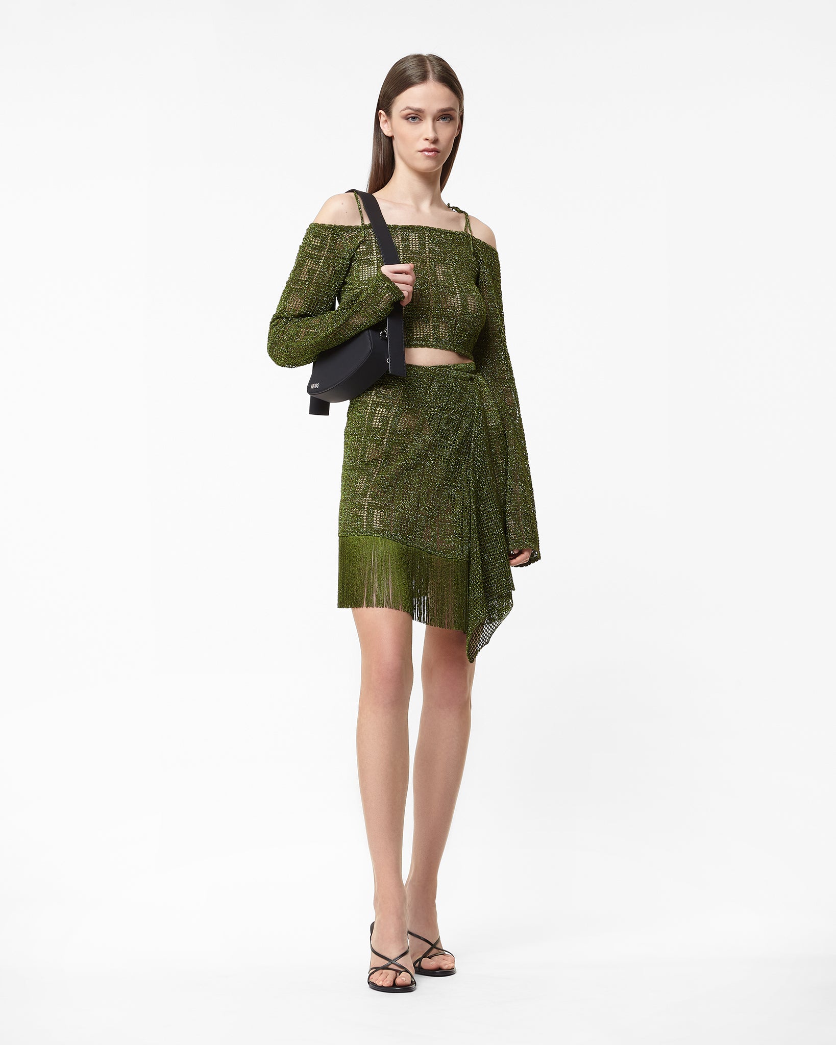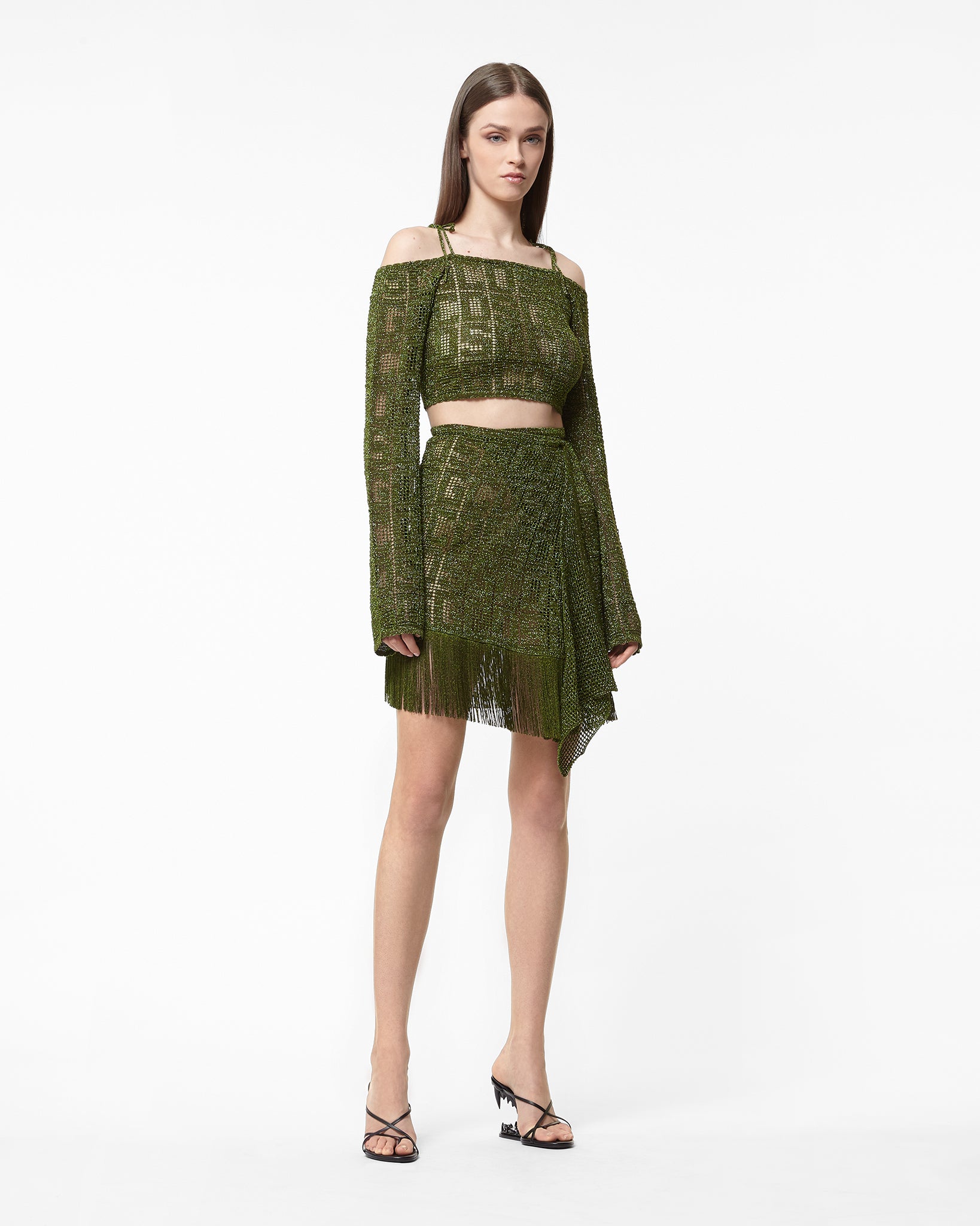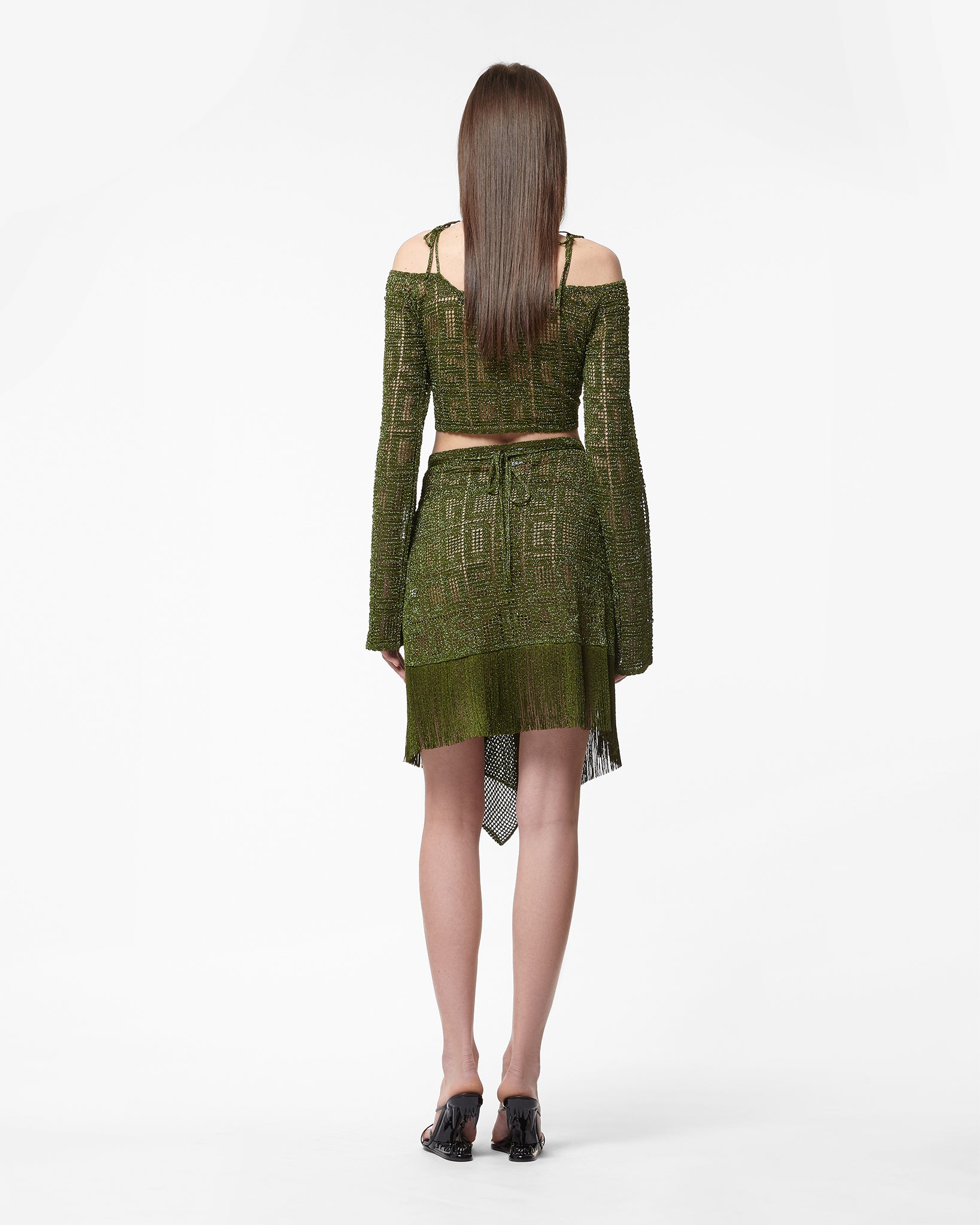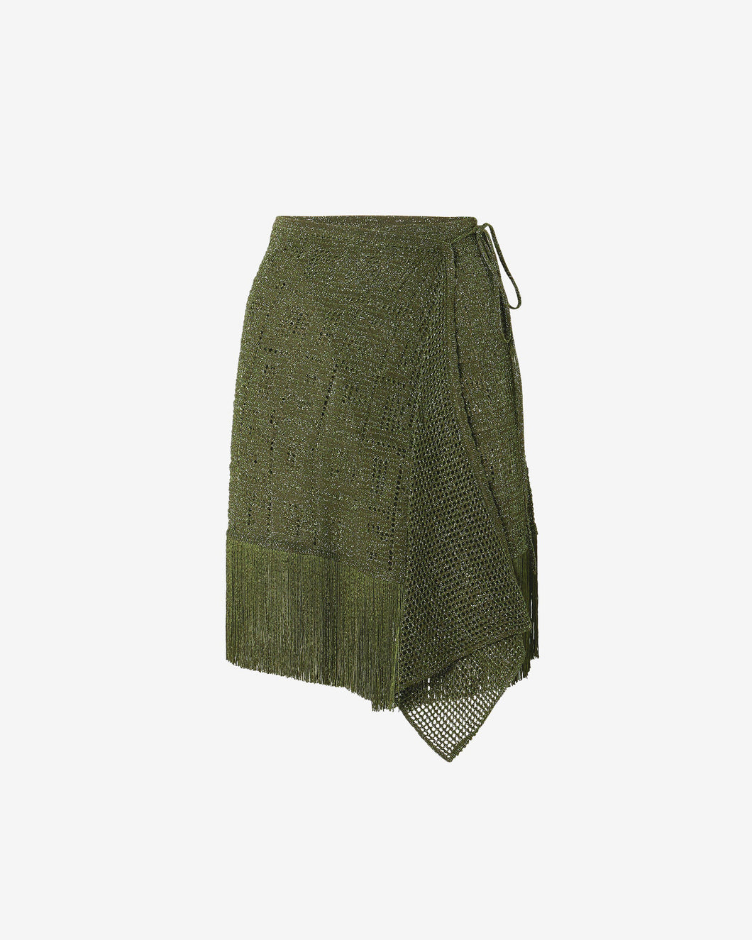 Lurex sarong mini skirt with see through crochet GCDS monogram effect. Mesh drape on the front. Knitted bow closure. Short fringe on the bottom.